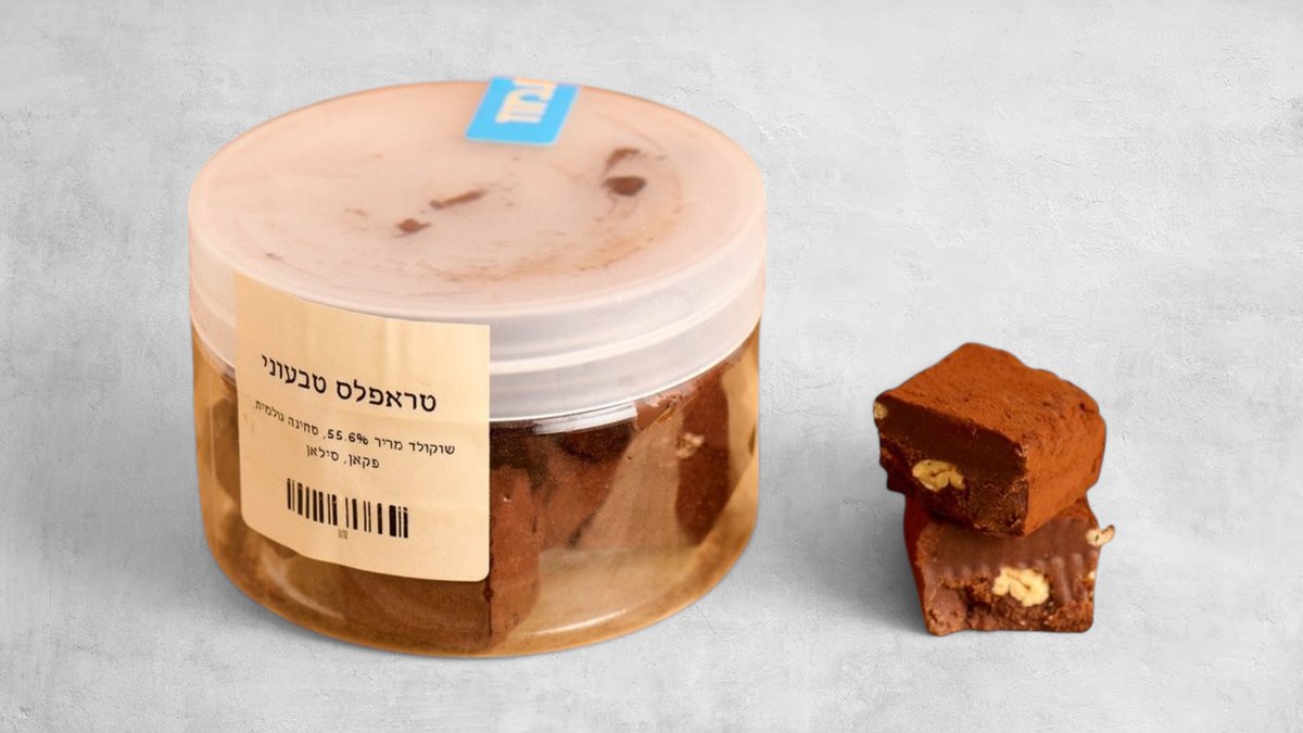 טראפלסים במרקם נימוח, עשויים שוקולד מריר וקקאו הולנדי. מכילים טחינה ופקאן צנצנת מתנה יפהפייה או טעם מתוק אלגנטי לסיום ארוחה. ✅ שוקולד מריר איכותי ✅ מתאים למתנה ללא גלוטן