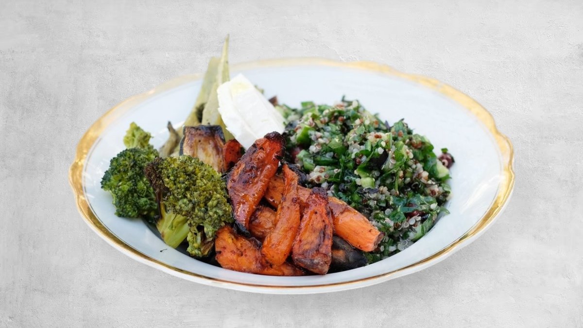 סלט טאבולה רענן של קינואה מנומרת, מלפפון, ירוקים טריים ורימונים, בתיבול שמן זית ולימון. מוגש עם ירקות אורגניים צלויים, טחינה עדינה וגבינת פטה מלוחה לאיזון מושלם. ניתן להחליף פטה כבשים בפטה שקדים טבעית תוצרת הבית למנה טבעונית ✅ קינואה עשירה בחלבון ✅ ירקות אורגניים עונתיים צלויים ✅ כולל טחינה וגבינת פטה ✅ אפשרות למנה טבעונית ⚠️ מכיל חלב