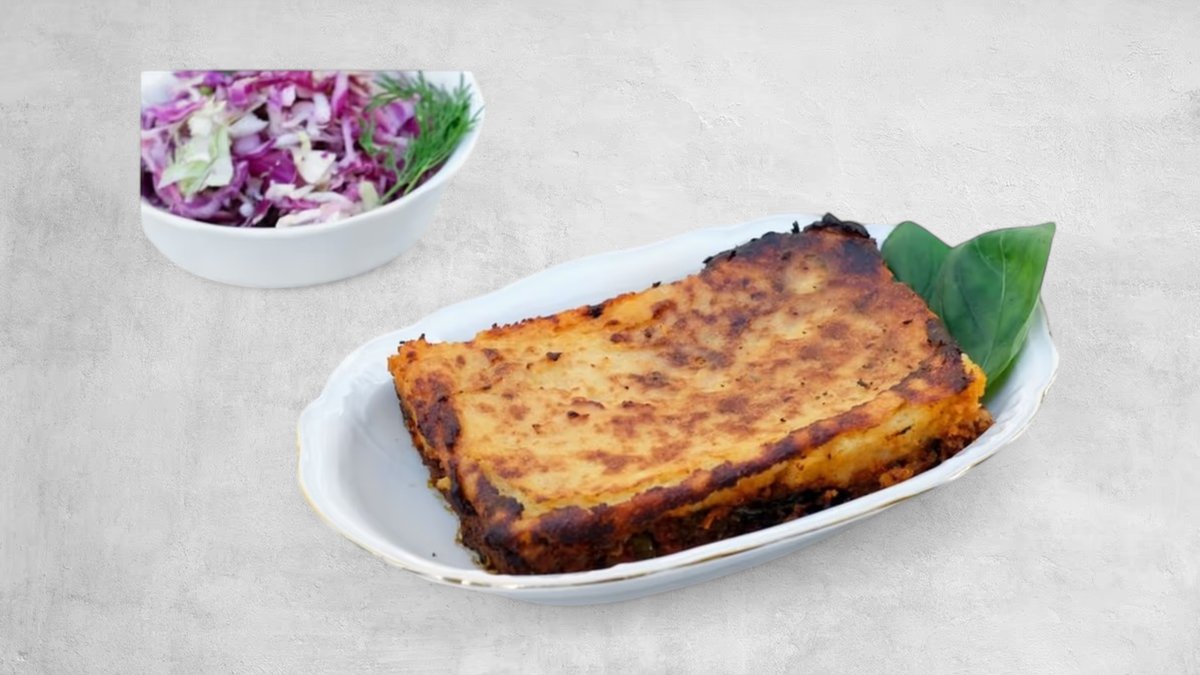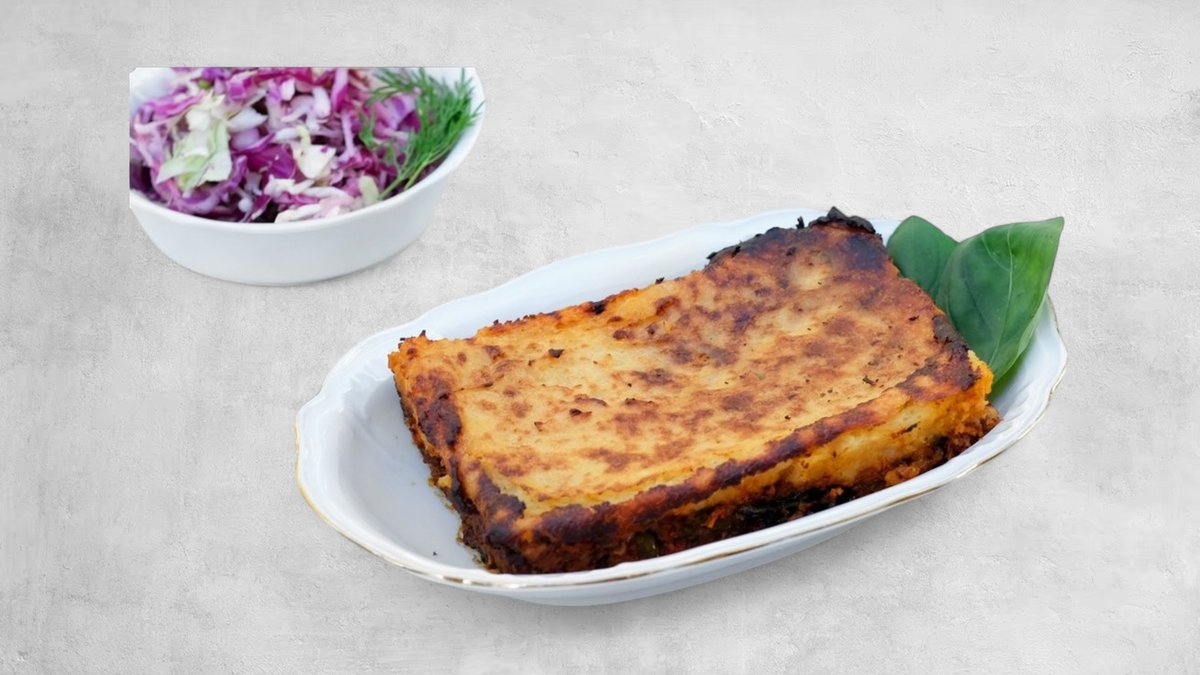 מאפה של ראגו בקר מהגולן עם פירה תפוחי אדמה נימוח מעל מוגש עם סלט כרוב בשמן זית ולימון . אוכל מנחם שמגיע מארצות אירופה הקרירות. ✅ בשר בקר “חי־בריא” איכותי ✅ פירה טרי, לא מתועש, עשוי מתפוחי אדמה אורגניים