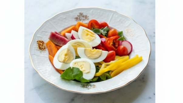 סלט ירקות גינה אורגניים צבעוני וטרי, עם ביצה קשה פרוסה – מנה קלילה, רעננה ומשביעה. מוגש עם ויניגרט קלאסי וטחינה. ניתן להוסיף גבינת פטה כבשים או פטה שקדים. ✅ ירקות אורגניים עונתיים טריים