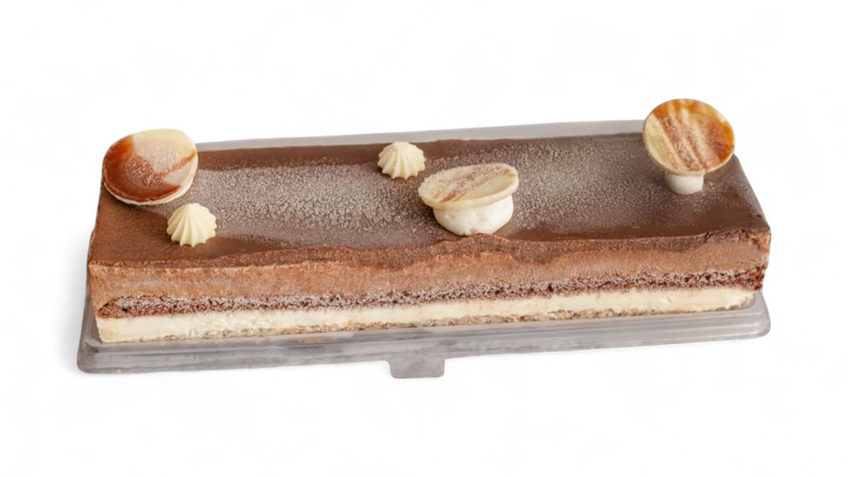 שכבות של מרנג אגוזים ומרנג שוקולד אגוזים וביניהן קרם שוקולד לבן, קרם שוקולד נוגט בציפוי של גנאש שוקולד חלב | מגיע קפוא