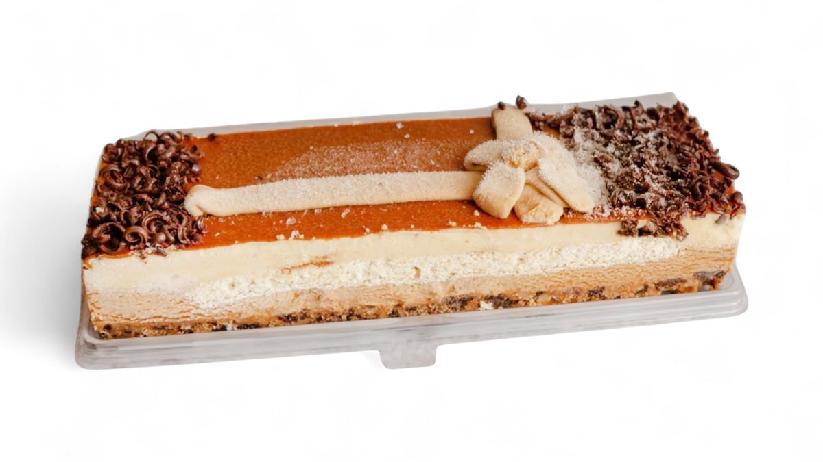 עוגת גבינה אפויה בציפוי גנאש קפוצ'ינו עדין ובעיטור שבבי פקאן סיני | מגיע קפוא