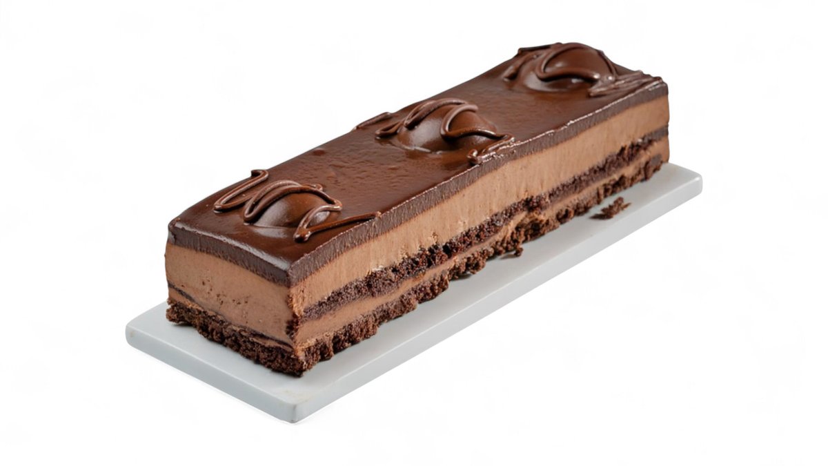 שכבות של קרם שוקולד לבן, קרם שוקולד בלגי, פניני שוקולד ובראוניס, על מצע של מרנג שוקולד ואגוזים בציפוי גנאש שוקולד מריר ופניני שוקולד