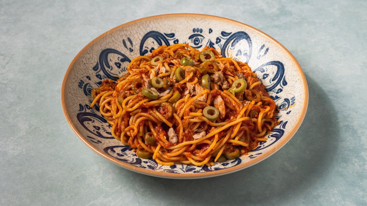 טונה וזיתים ירוקים ברוטב עגבניות טריות ויין מוגש עם פרמז׳ן