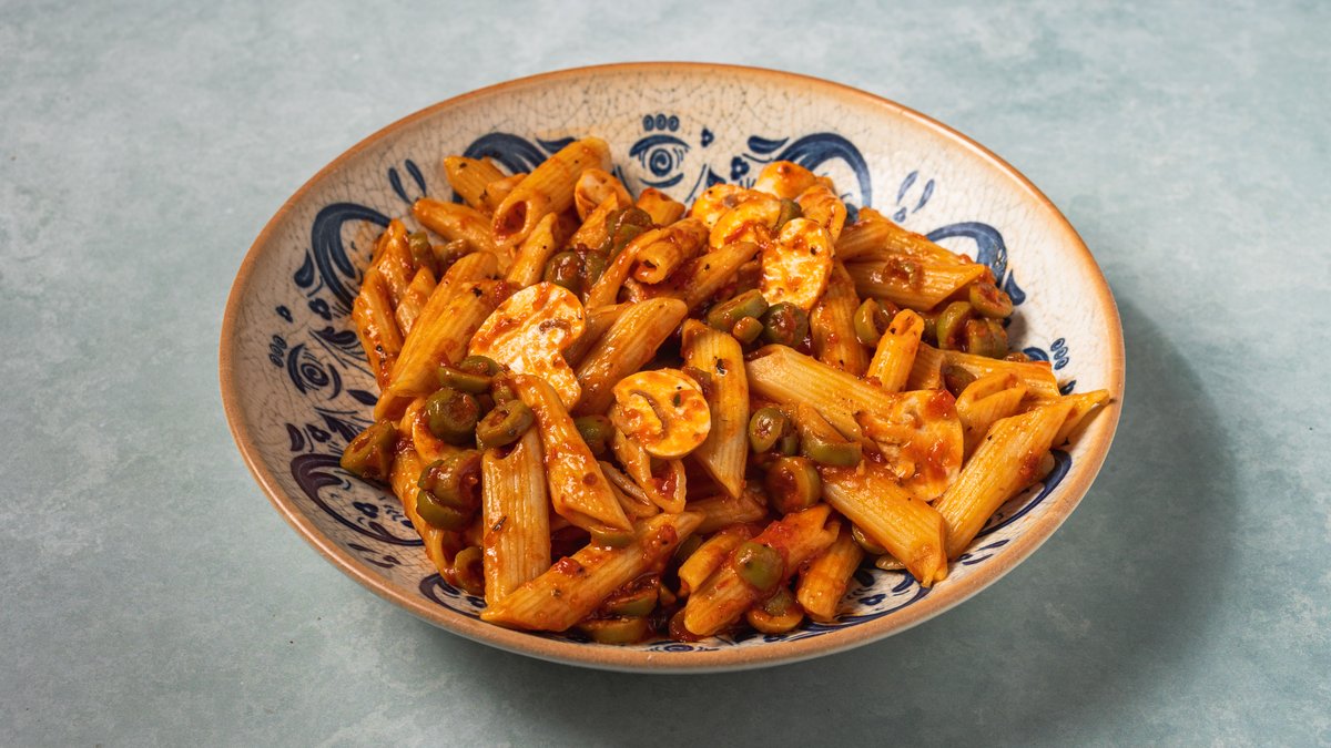 פטריות שמפיניון וזיתי קלמטה ברוטב עגבניות טריות ויין מוגש עם פרמז׳ן