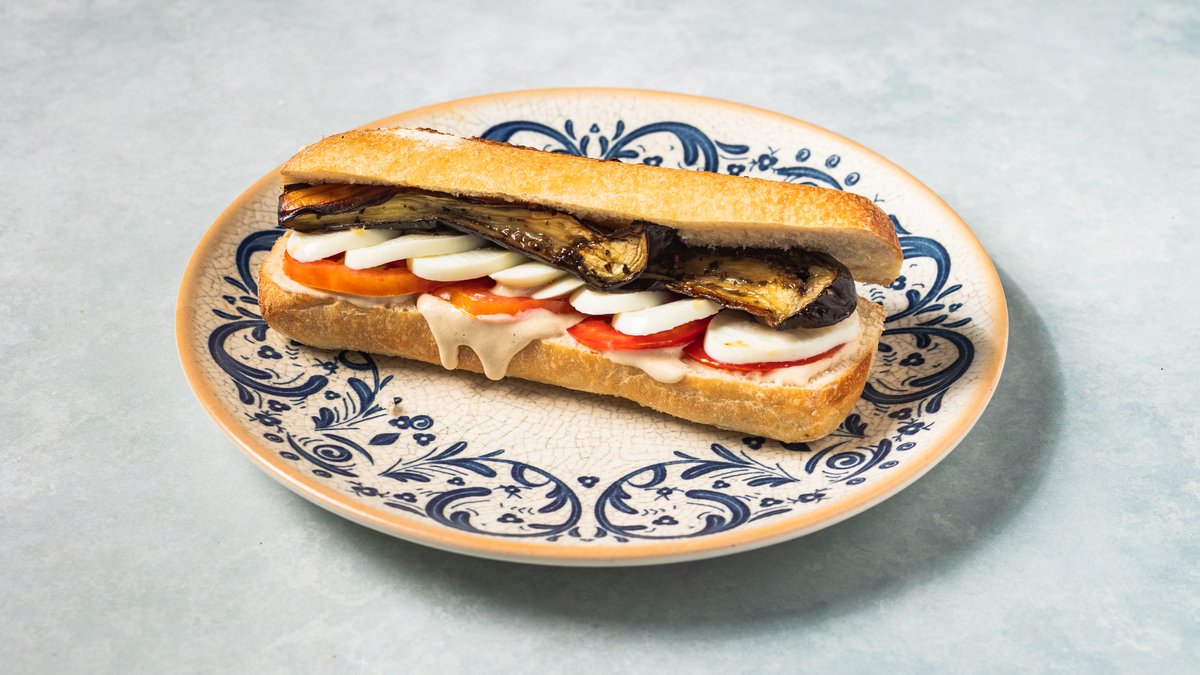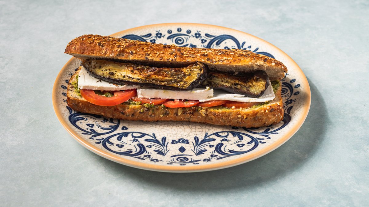 גבינה בולגרית 5%, פסטו, חציל קלוי ועגבניה