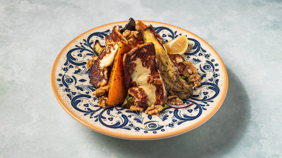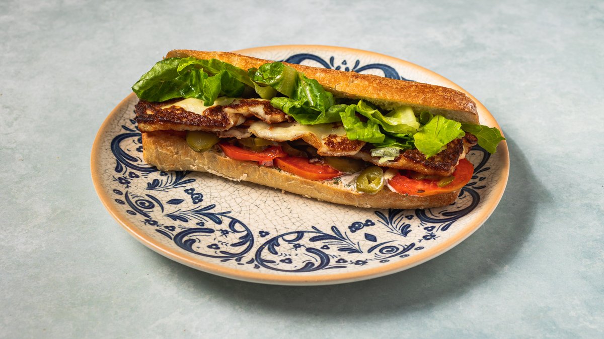 גבינת חלומי, רוטב אלי אוליו, חסה, מלפפון חמוץ ועגבניה