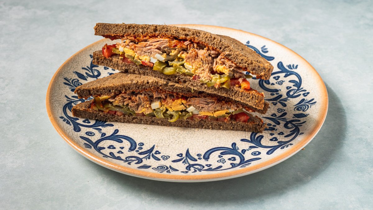 טונה, ממרח טוניסאי, ביצה קשה, מלפפון חמוץ ועגבניה