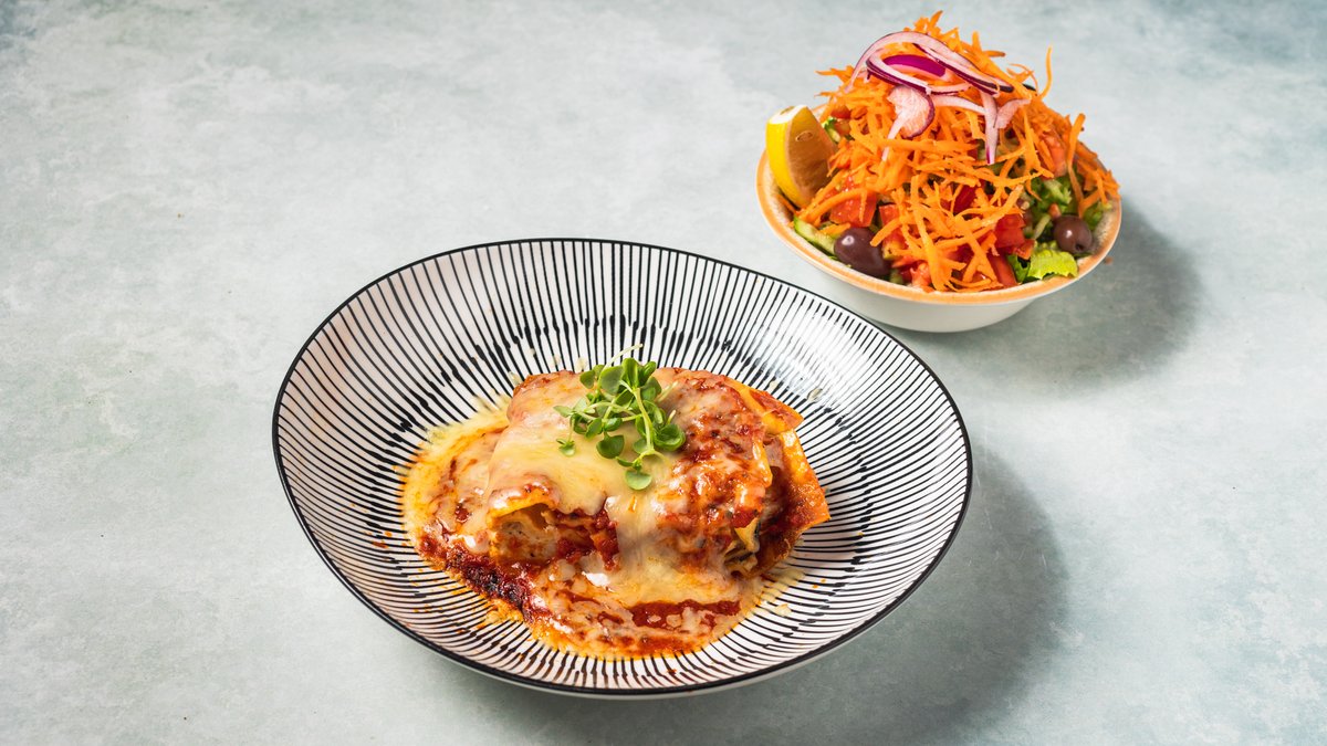 לזניה עם מיקס גבינות, חציל, רוטב עגבניות טריות ועשבי תיבול מוגש עם סלט אישי