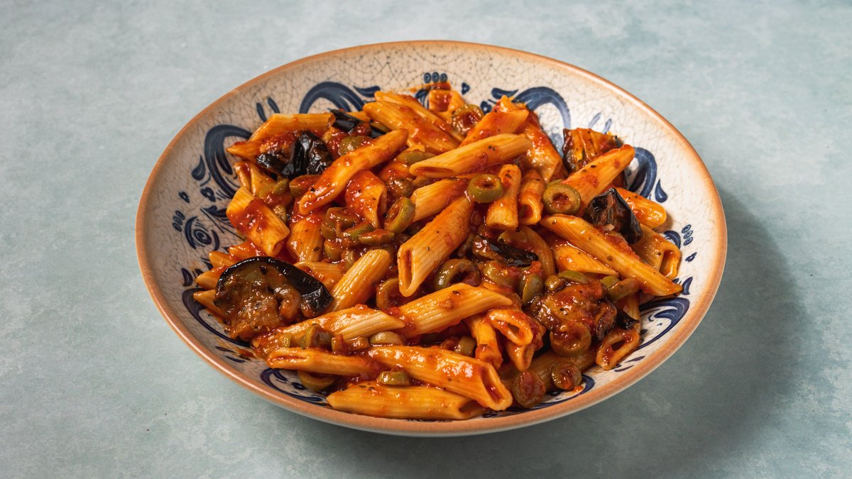 חצילים וזיתים ירוקים ברוטב עגבניות טריות ויין מוגש עם פרמז׳ן