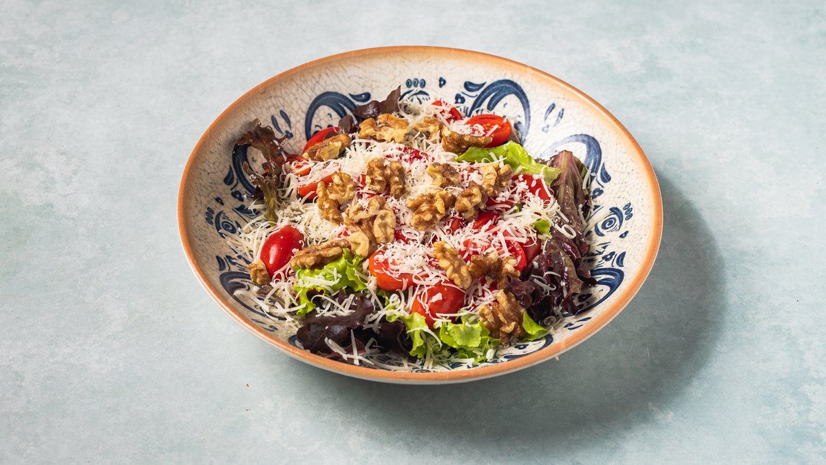 חסה ברוטב ויניגרט, עגבניות שרי, אגוזי מלך וגבינת פרמז'ן