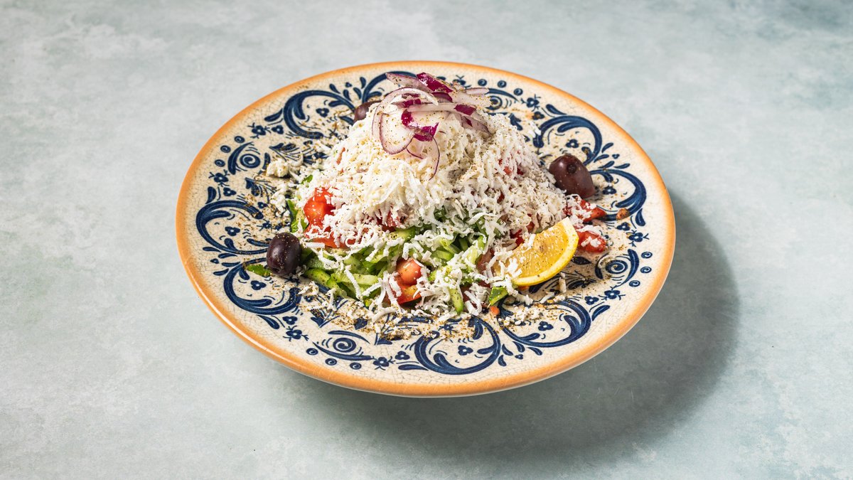 גבינה בולגרית % 5, חסה, עגבנייה, מלפפון, בצל סגול, זיתי קלמטה, שמן זית וזעתר