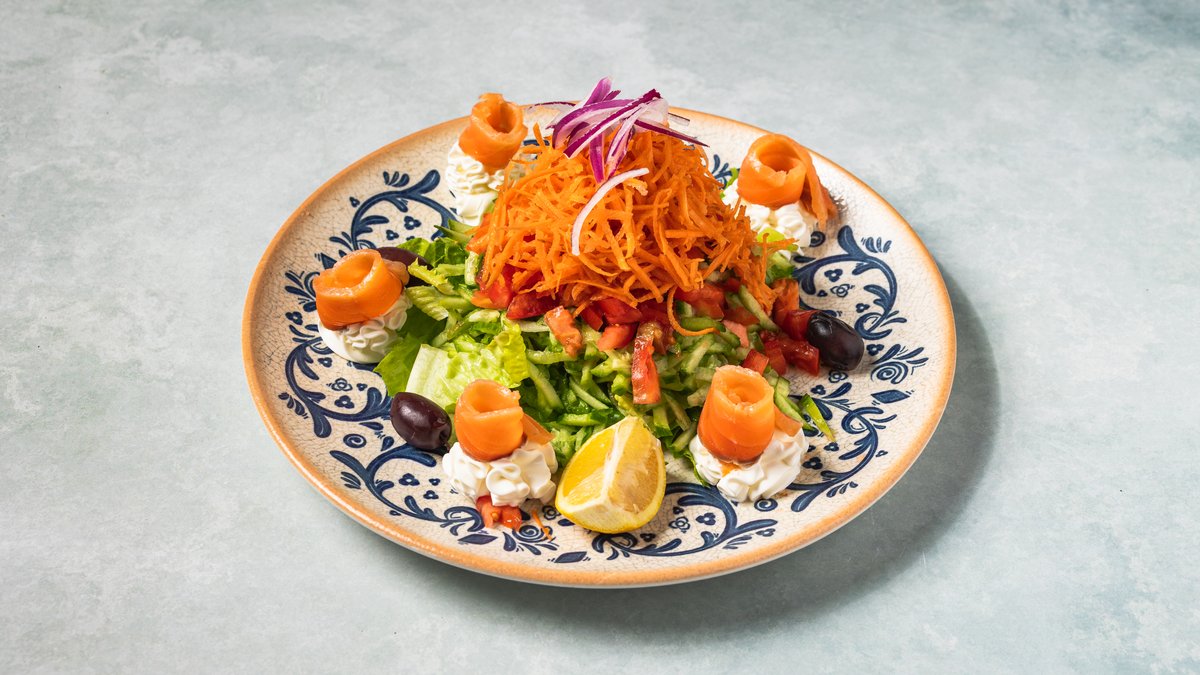 רצועות סלמון מעושן, גבינת שמנת, חסה, עגבניה, מלפפון, גזר, בצל סגול וזיתי קלמטה