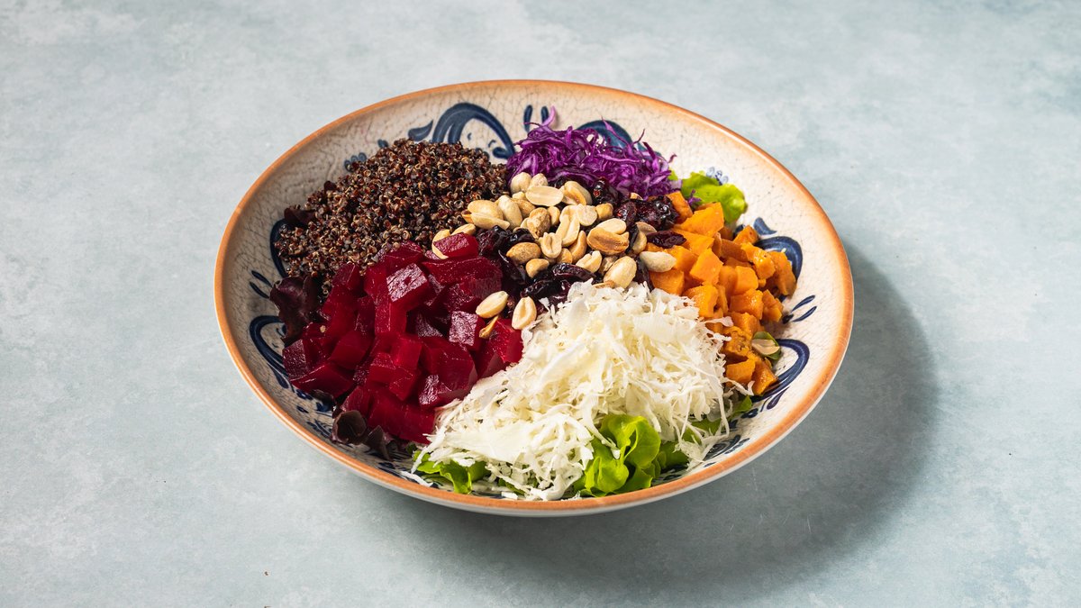קינואה, סלק, בטטות קלויות, כרוב סגול, כרוב לבן, חמוציות, עשבי תיבול, בוטנים קלויים וחסה מסולסלת