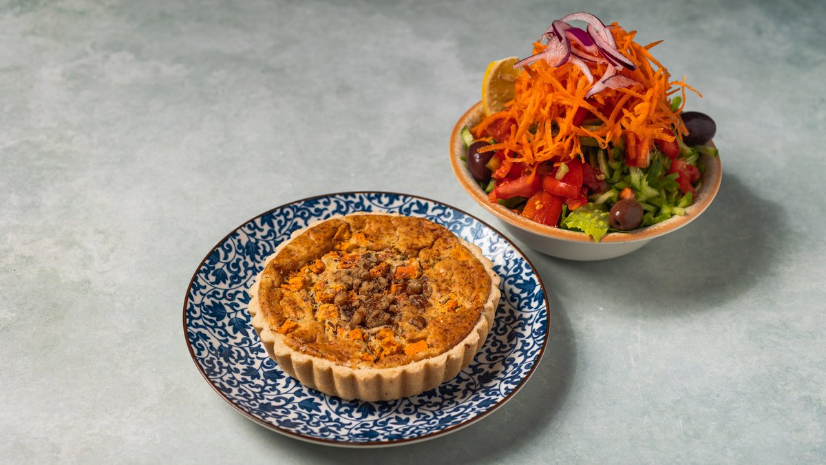 קיש מבצק פריך, ברוקולי, גבינות ורויאל מוגש עם רוטב אלפרדו וסלט אישי