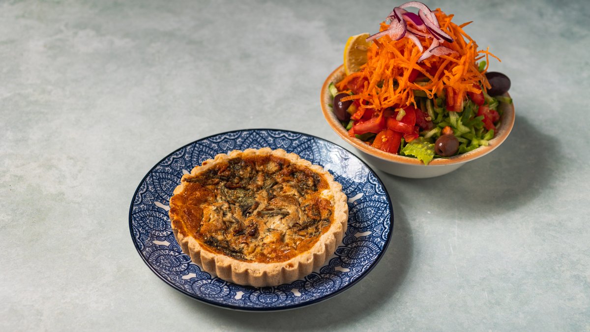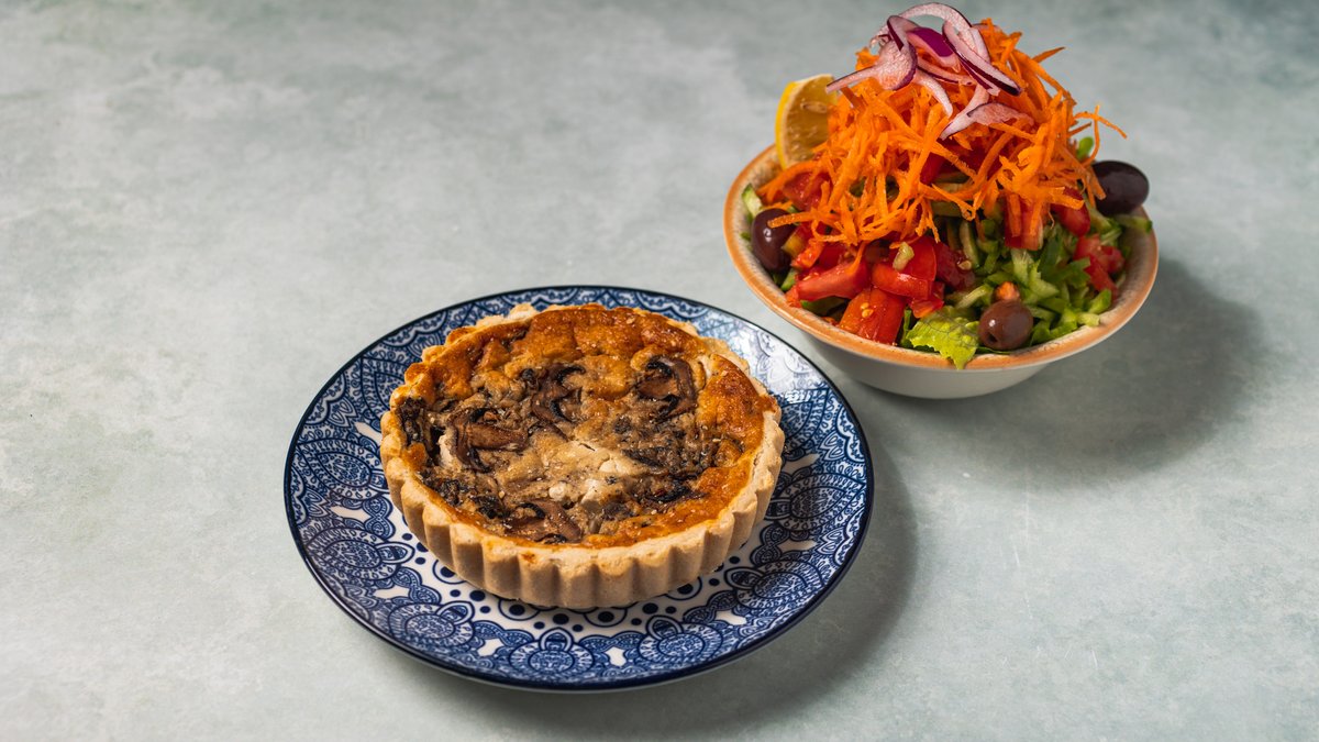 קיש מבצק פריך, פטריות, גבינות ורויאל מוגש עם רוטב אלפרדו וסלט אישי