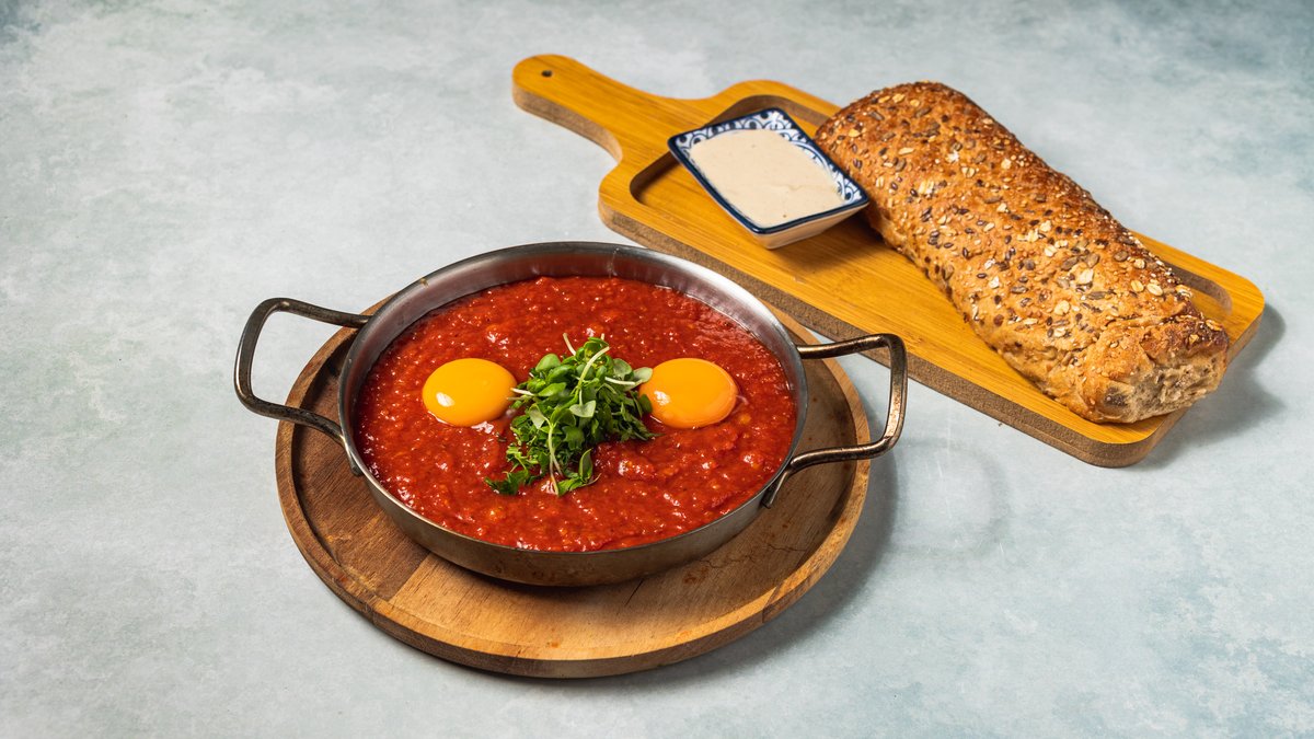 ביצים ברוטב עגבניות טריות מוגש עם לחם וטחינה