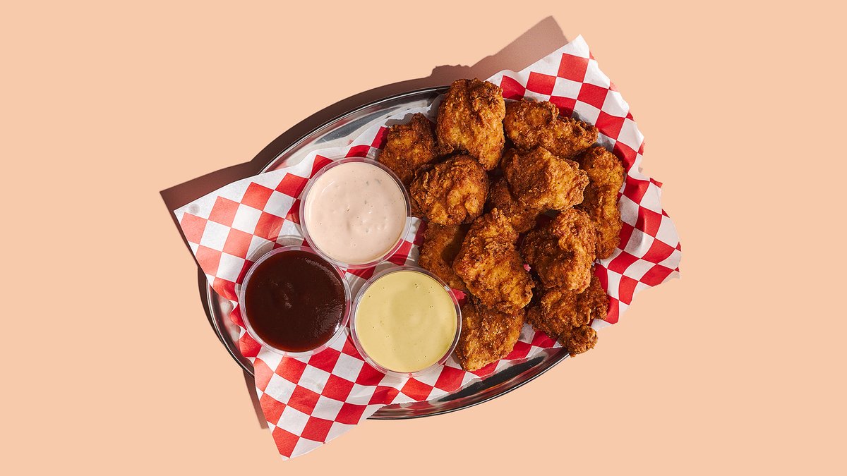 נאגטס עסיסיים מוגש עם רטבים | חרדל דבש, רוטב ברביקיו ואלף האיים. (לא כשר, מכיל גלוטן)