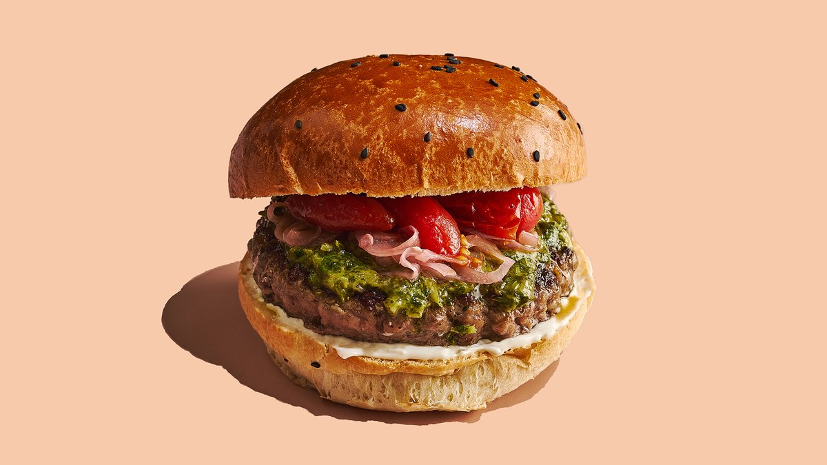 מיונז, צ'ימיצ'ורי, צ'דר, בצל מוחמץ, עגבניות על הגריל