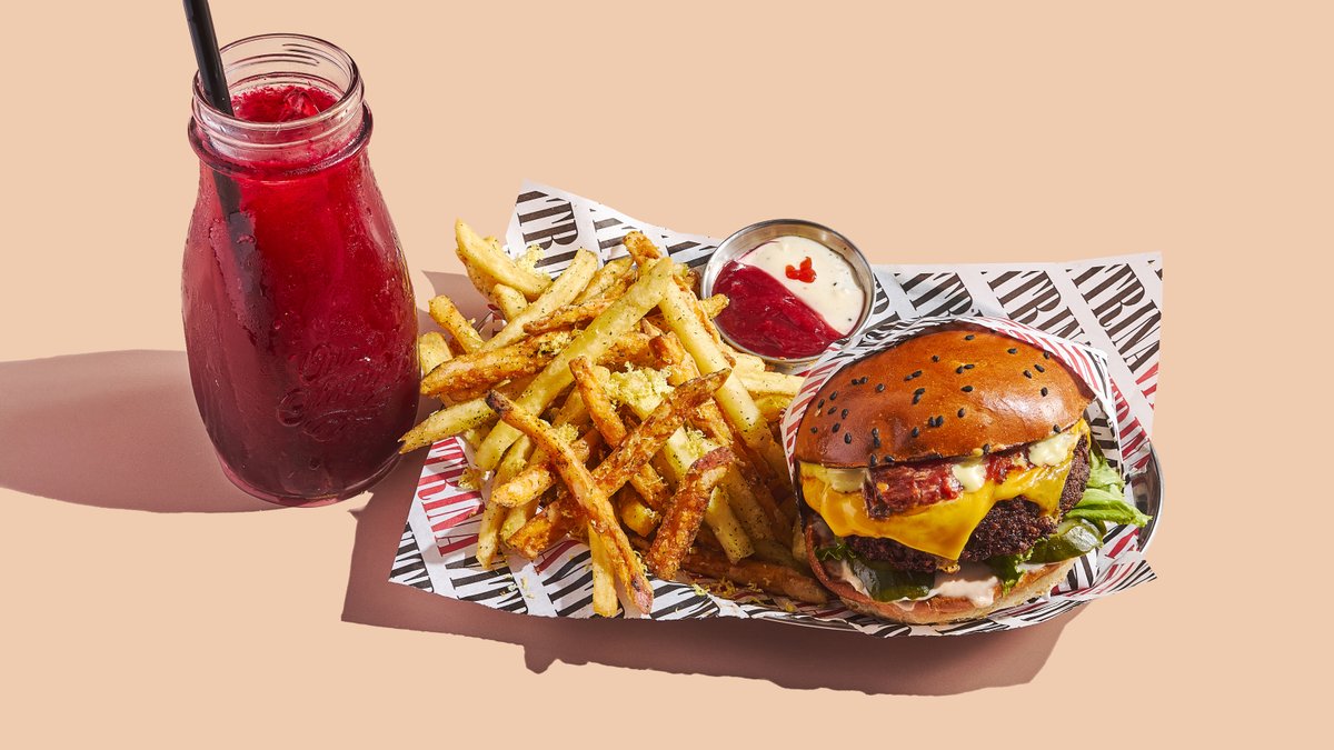 קציצה בעבודת יד, גבינת צ׳דר ,עגבניות צלויות, חסה, חמוצים, אלף איים, חרדל סילאן | צמחוני (מכיל גלוטן)