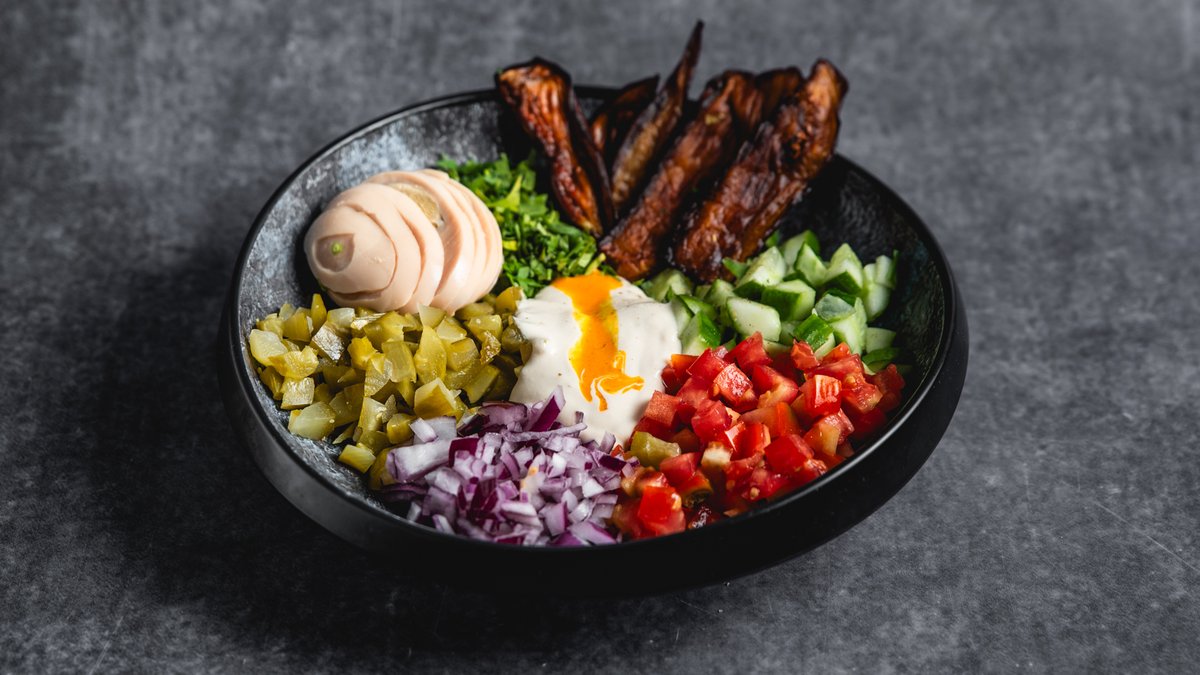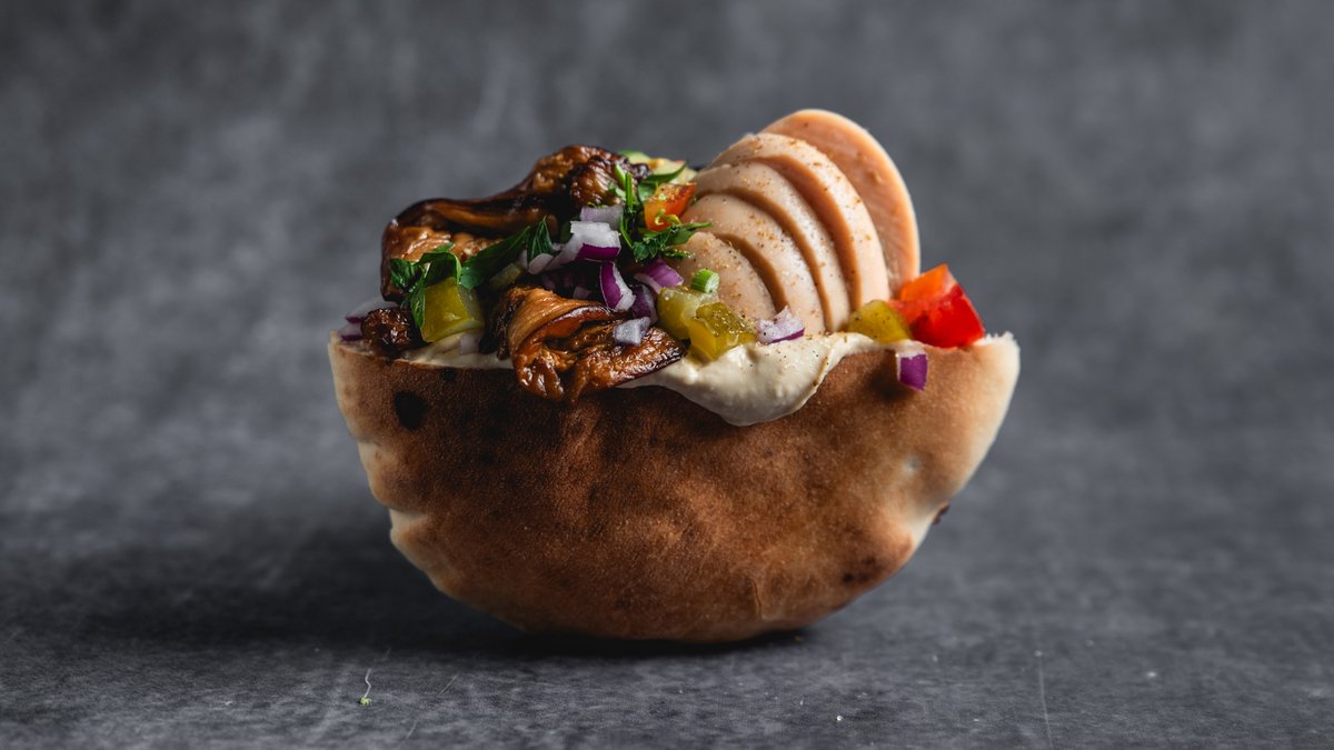 המנות מוגשות בפיתה עם סלטים וממרחים לבחירה 🥙