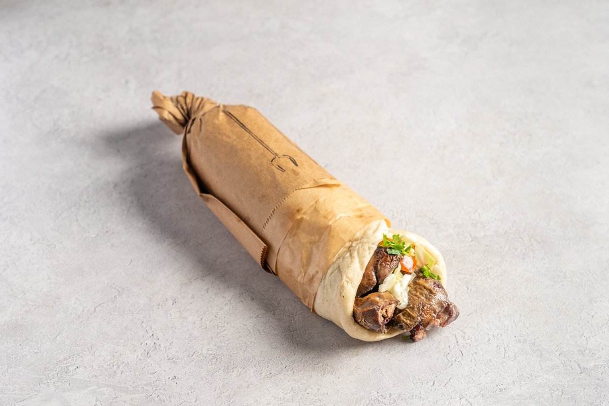 שיפוד כבד עוף בלאפה עם סלטים וממרחים לבחירה מוגש לצד מיקס חמוצי הבית 🥗