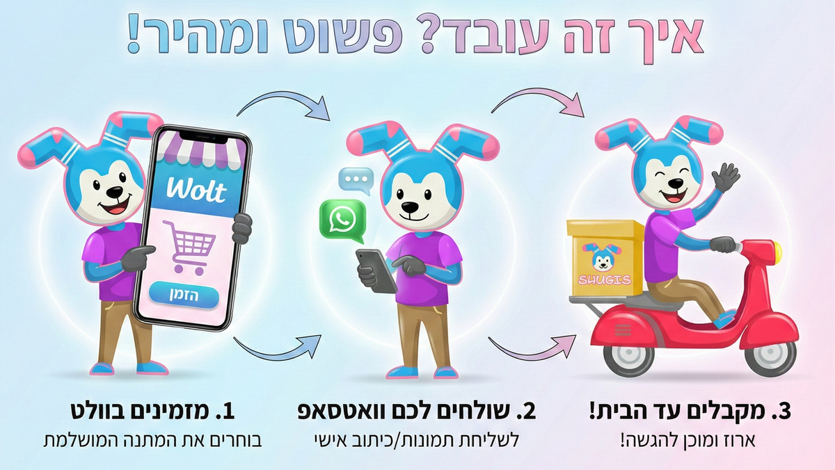 איך זה עובד? מיד לאחר ביצוע ההזמנה תקבלו מאיתנו הודעת WhatsApp אוטומטית עם בקשה לשליחת התמונות עבור המוצרים שבחרתם. אנחנו נשתמש בתמונות כדי לעצב לכם את המתנה האישית והמושלמת 🎁 כדי לזרז את התהליך ולהבטיח הכנה מהירה — אנא הכינו מראש את התמונות ושלחו לנו אותן מיד עם קבלת הודעת הוואצפ מאיתנו ♥