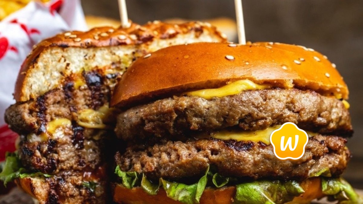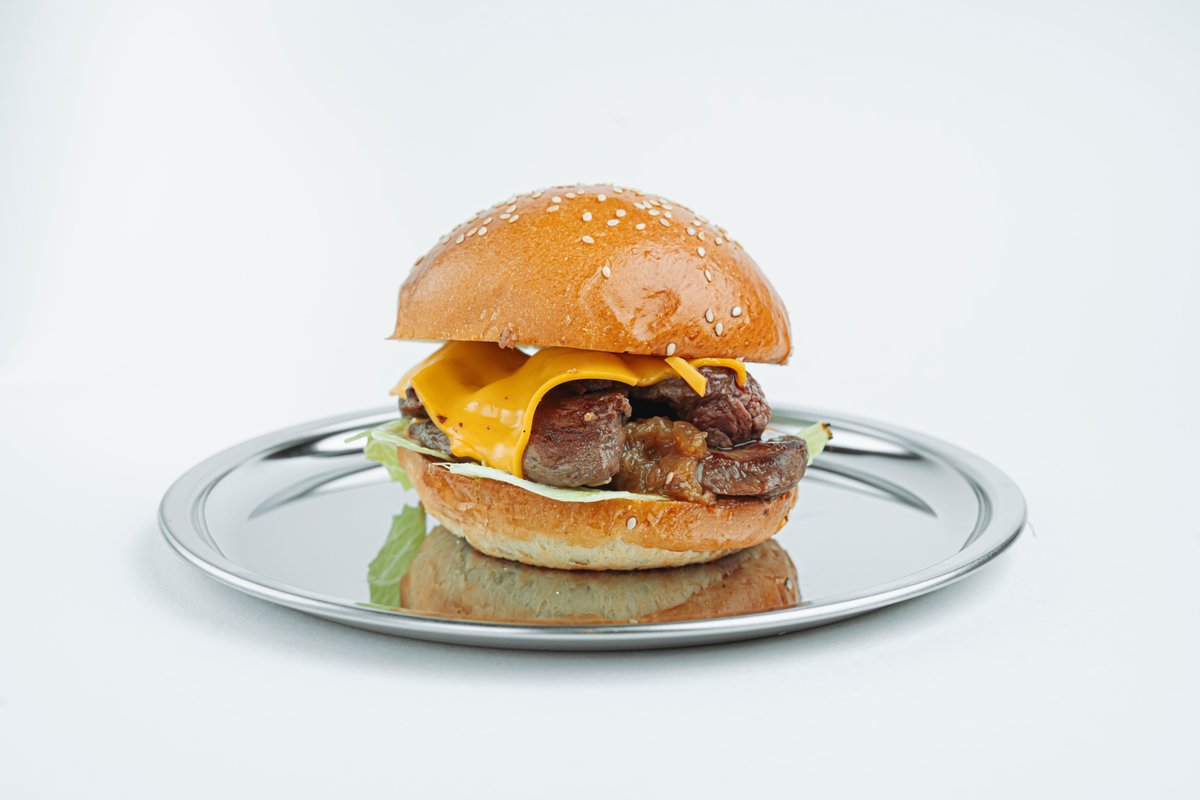 Dana əti, çedar pendiri, karamelizə olunmuş soğan, queen sousu, barbekyu sousu