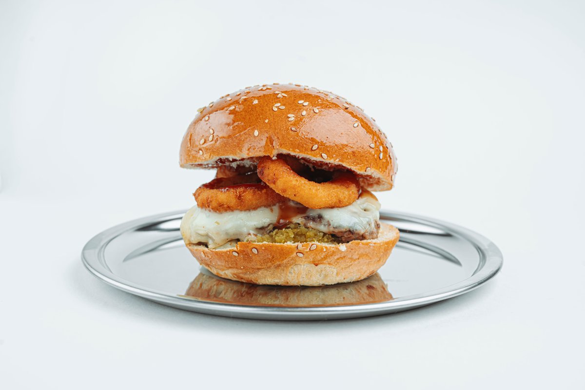 Dana əti , edam pendiri, soğan halqaları, yaşıl xalapenyo bibəri, barbekyu sousu (acılı)