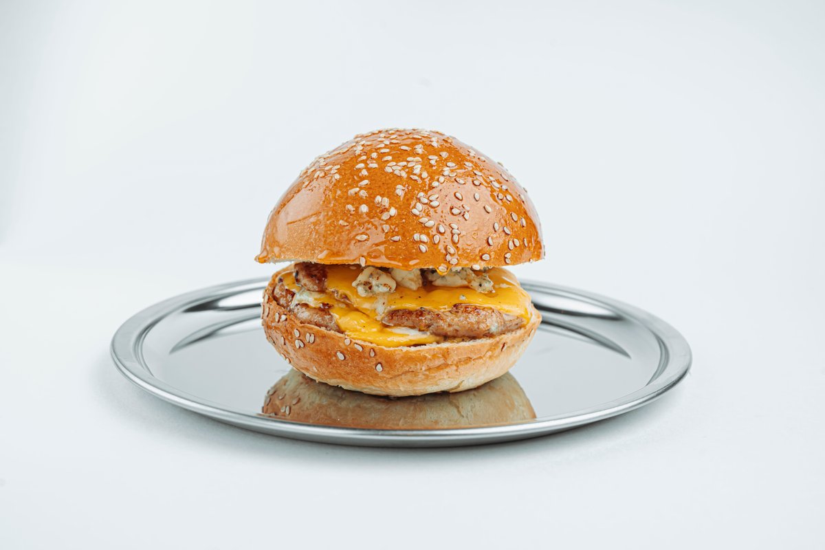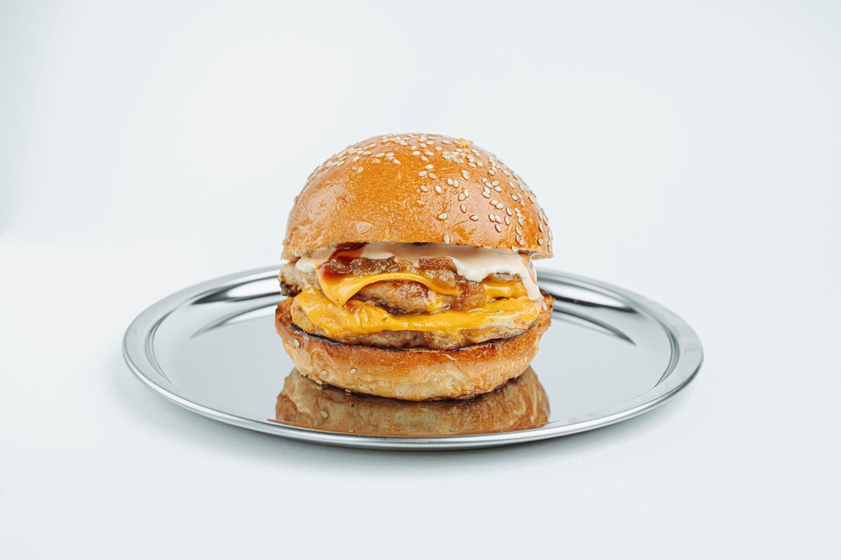 160 qr yağsız qovurma, çedar pendiri, karamelizə olunmuş soğan, mary jane sousu (yaşıl xalapenyo bibəri, parmezan pendiri), barbekyu sousu (acılı)