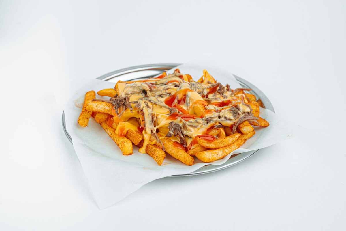 160 gr can əti, karamelizə olunmuş soğan, közdə qızardılmış göbələk, cheez whiz (əridilmiş çedar pendiri), sriraça sousu (acılı)