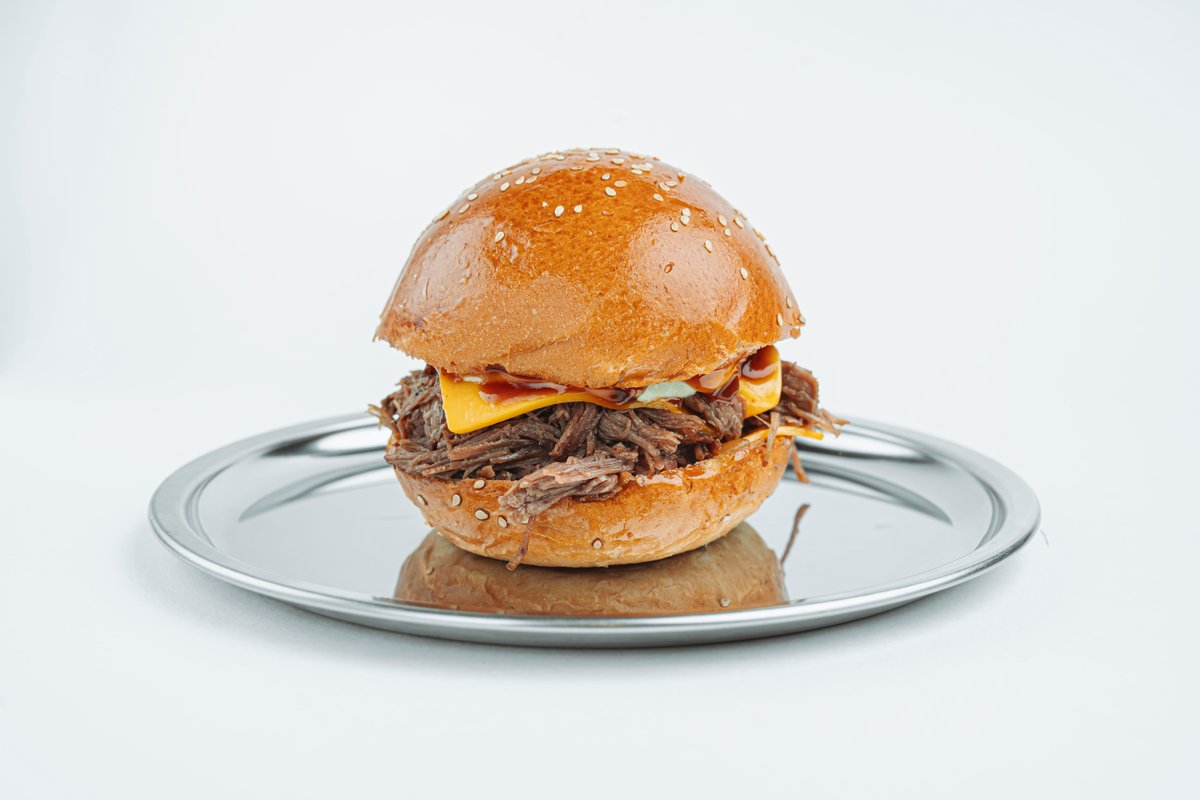 Dana əti, edam pendiri, karamelizə olunmuş soğan, mary jane sousu (yaşıl xalapenyo bibəri, parmezan pendiri), barbekyu sousu (acılı)