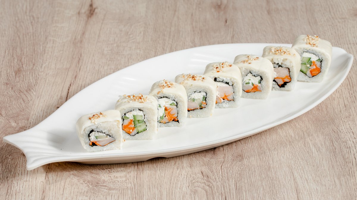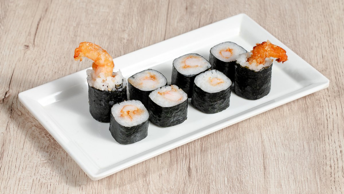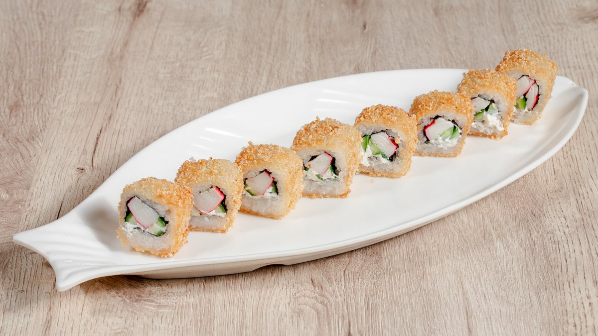 Düyü, yosun, labne pendir, xiyar, qızardılmış Krevetka, panko