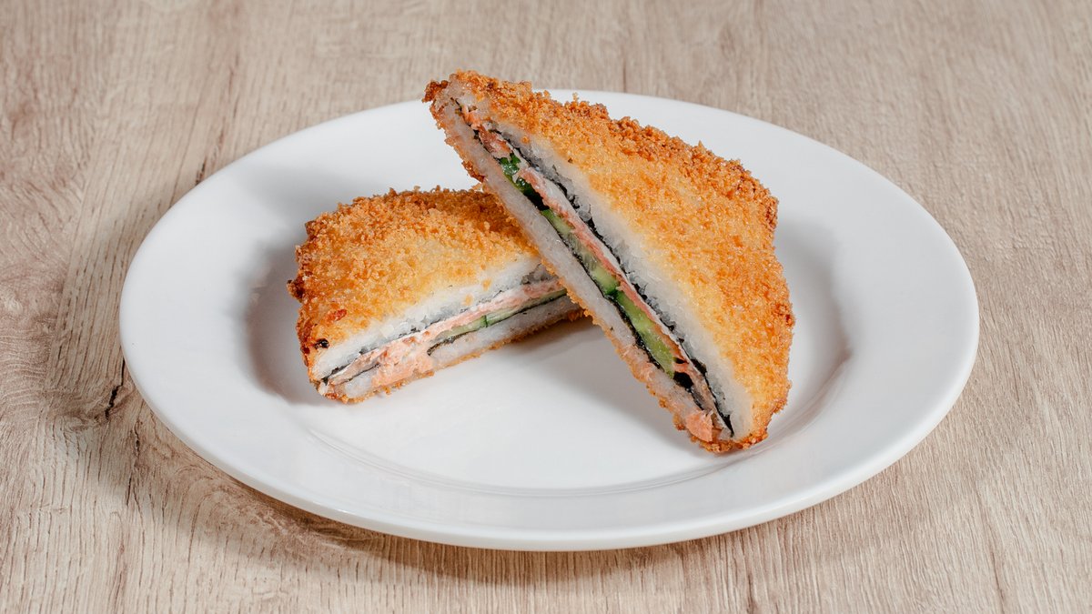 Düyü, yosun, xiyar, labne pendir, qızardılmış toyuq əti, panko