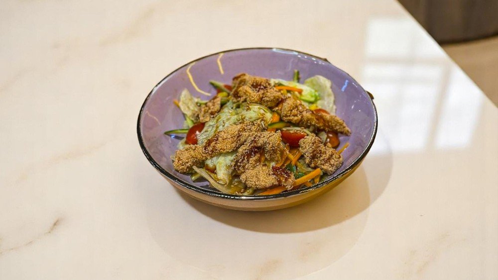 Izqarada toyuq əti, mini salat, pomidor,bolqar bibəri