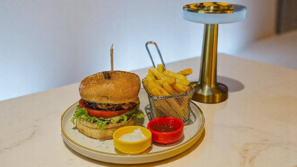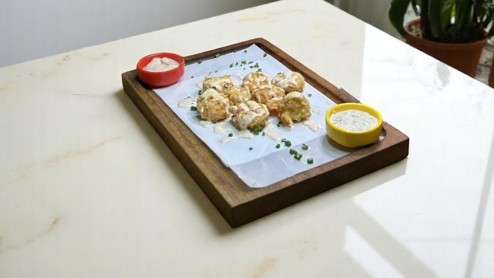 Pendir sousu, aysberq kahısı, köftə, çeddar pendiri, soğan halqaları