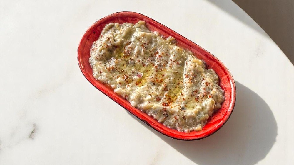 Köz badımcan, qatıq, sarımsaq, köftə