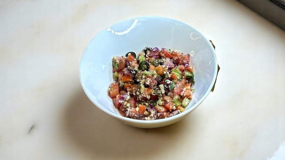 Qırmızı soğan, pomidor, xiyar, zeytun,qoz ləpəsi,nar
