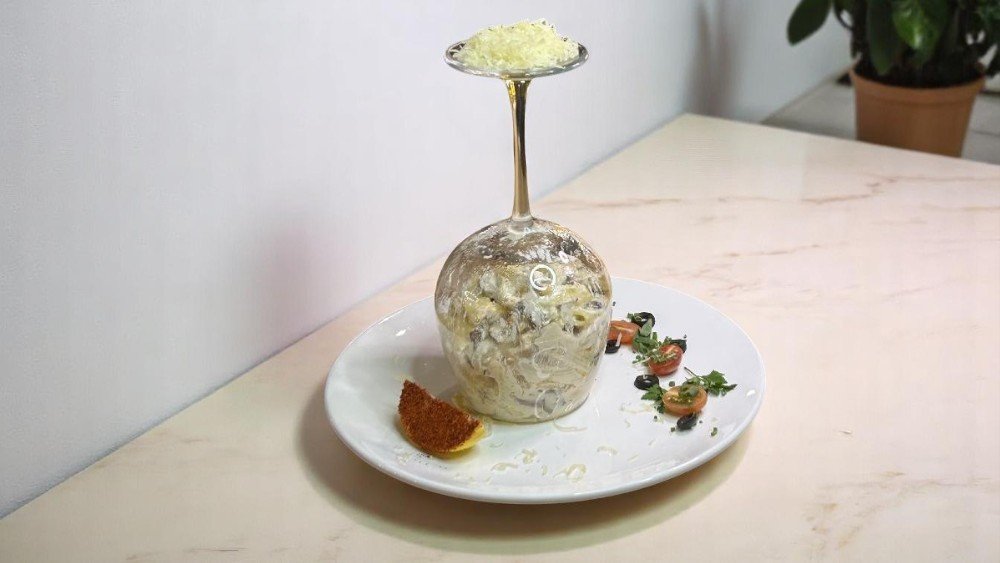 Qaymaq, göbələk, penne, toyuq filesi, parmezan pendiri
