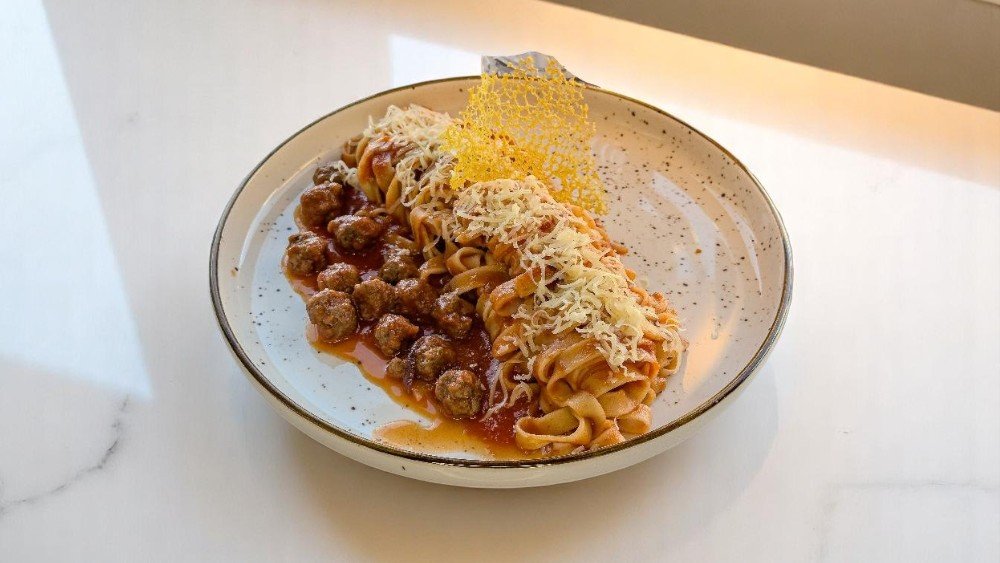 Dana ətli mini köftələr, pomidor sousu, tagliatelle