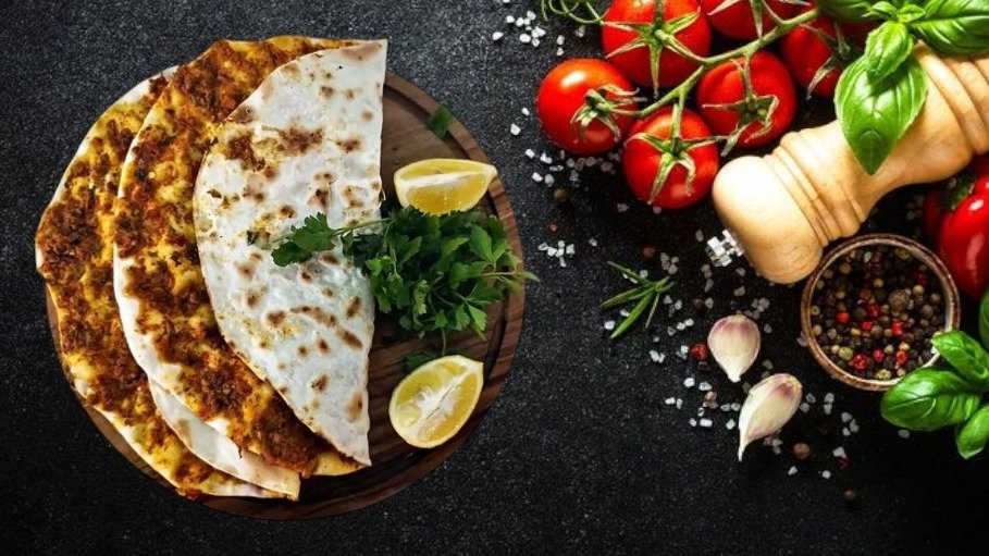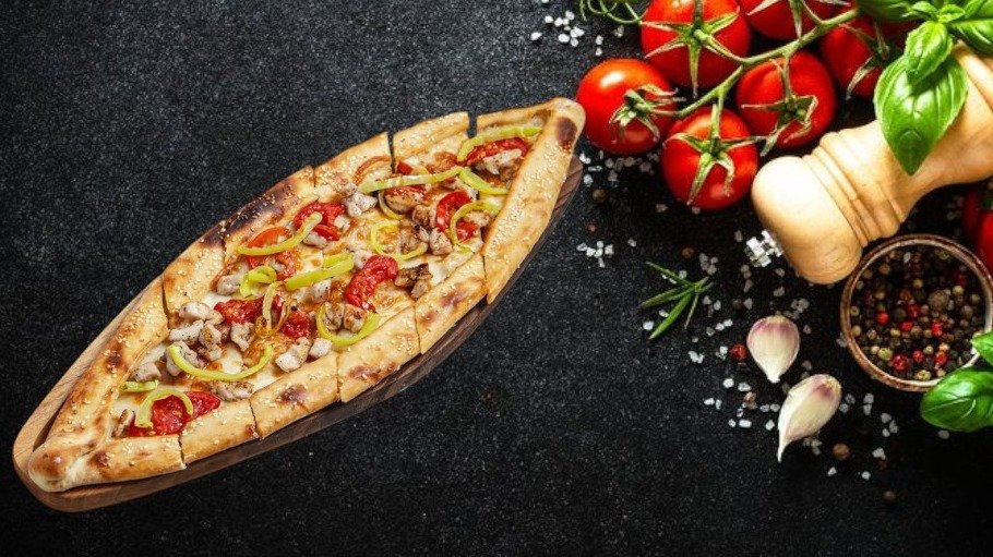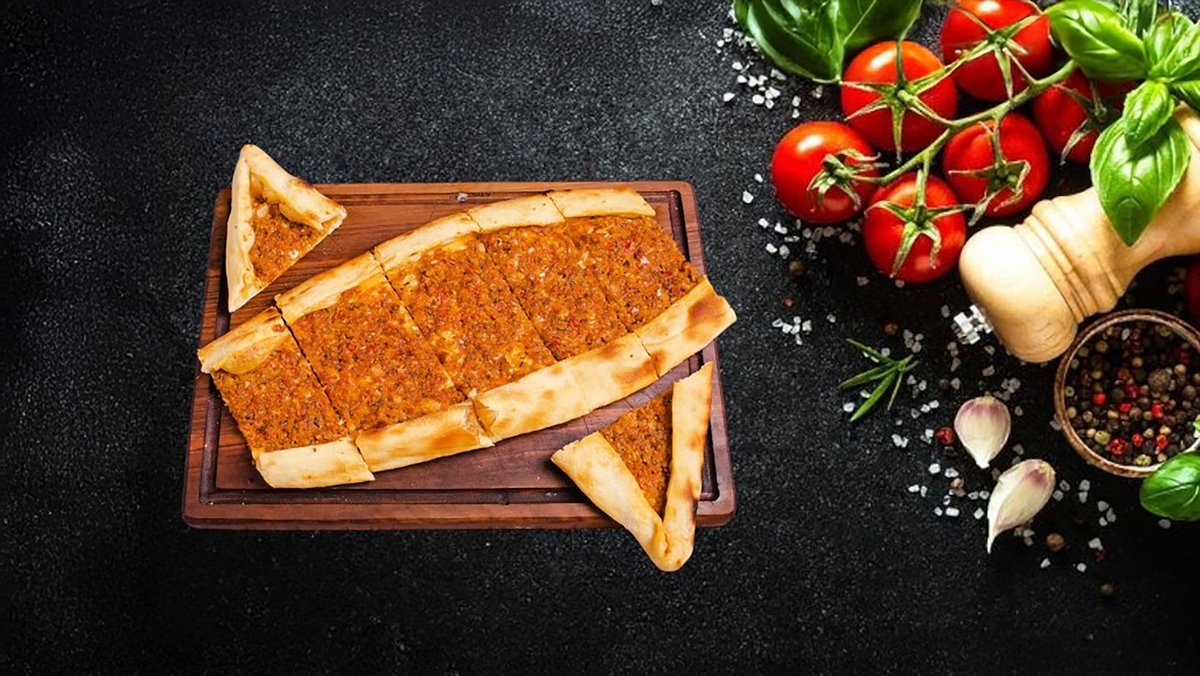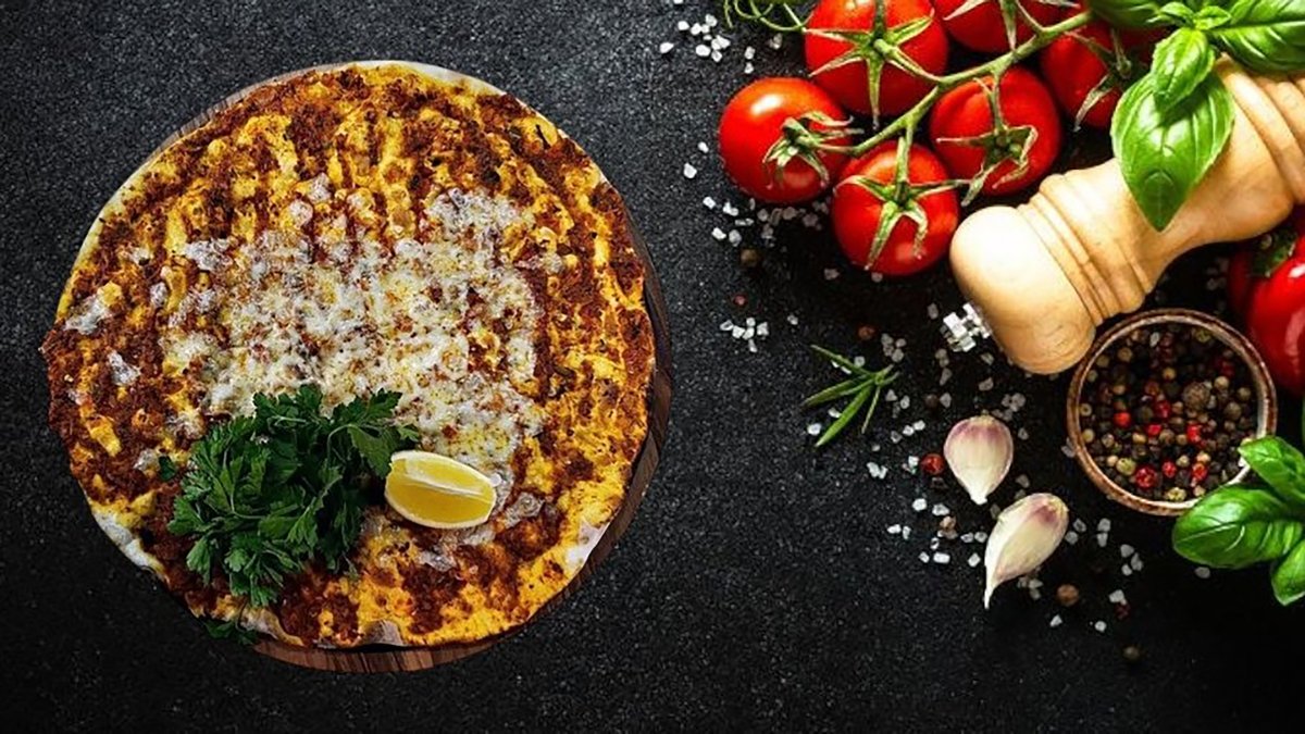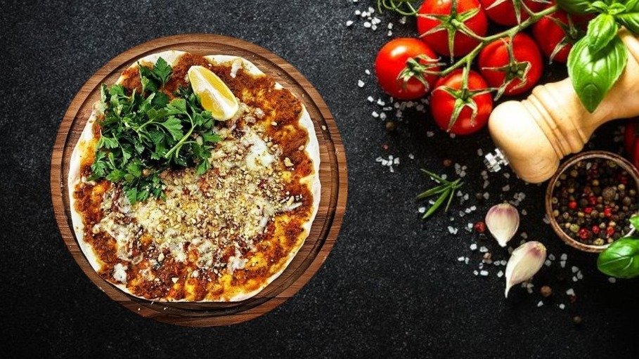Xəmir üzərində, qiymə, kaşar pendiri, soğan, pomidor, bibər, duz, istiot, ədviyyatlar