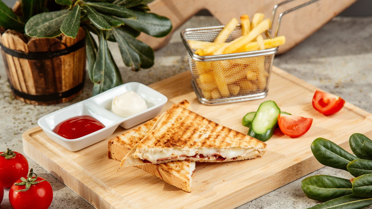 Tost çörəyi, sucuq, kaşar pendiri + kartof fri
