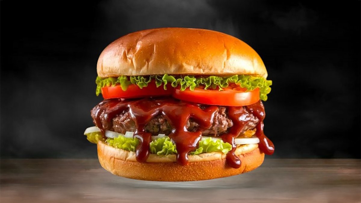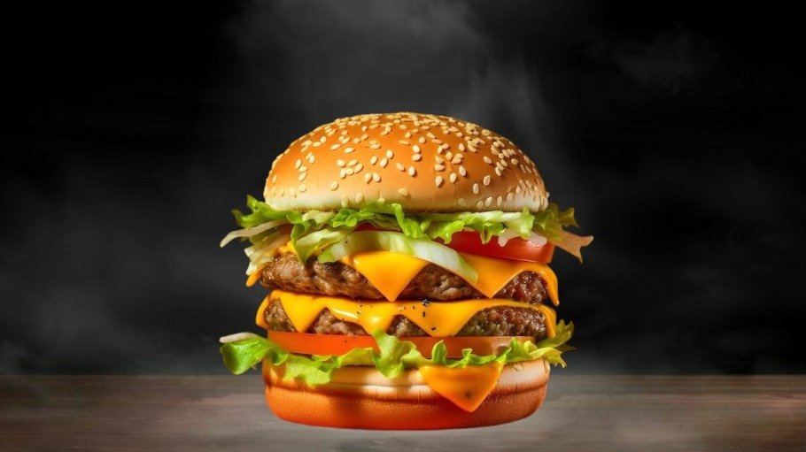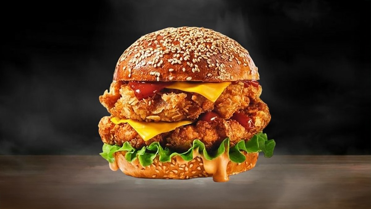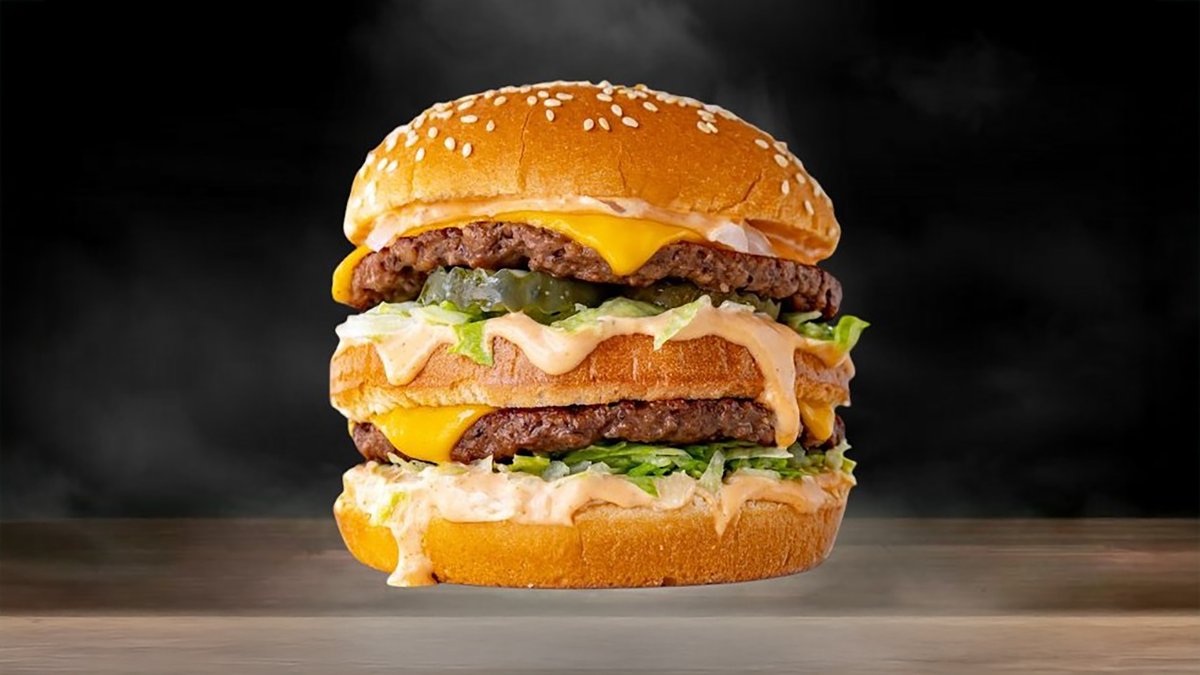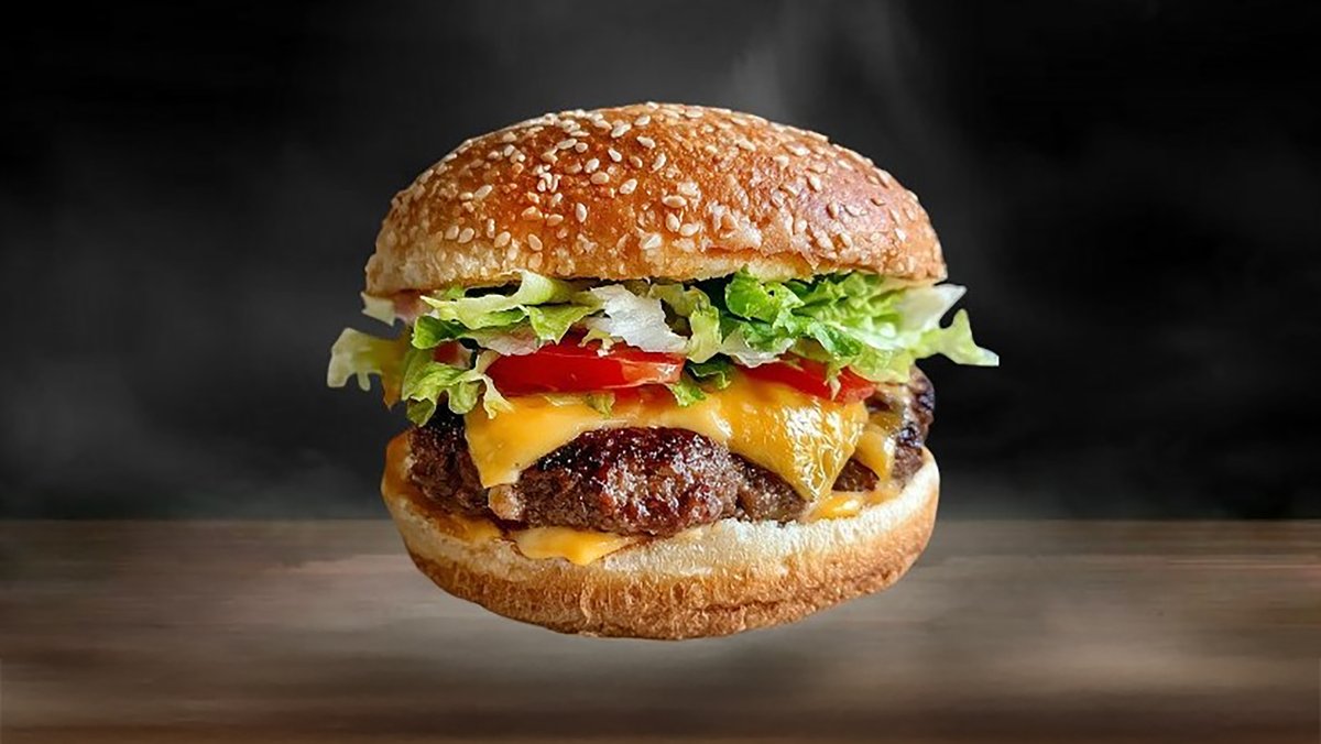Double mal əti kotleti, pendir, turşu xiyar, pomidor, kahı