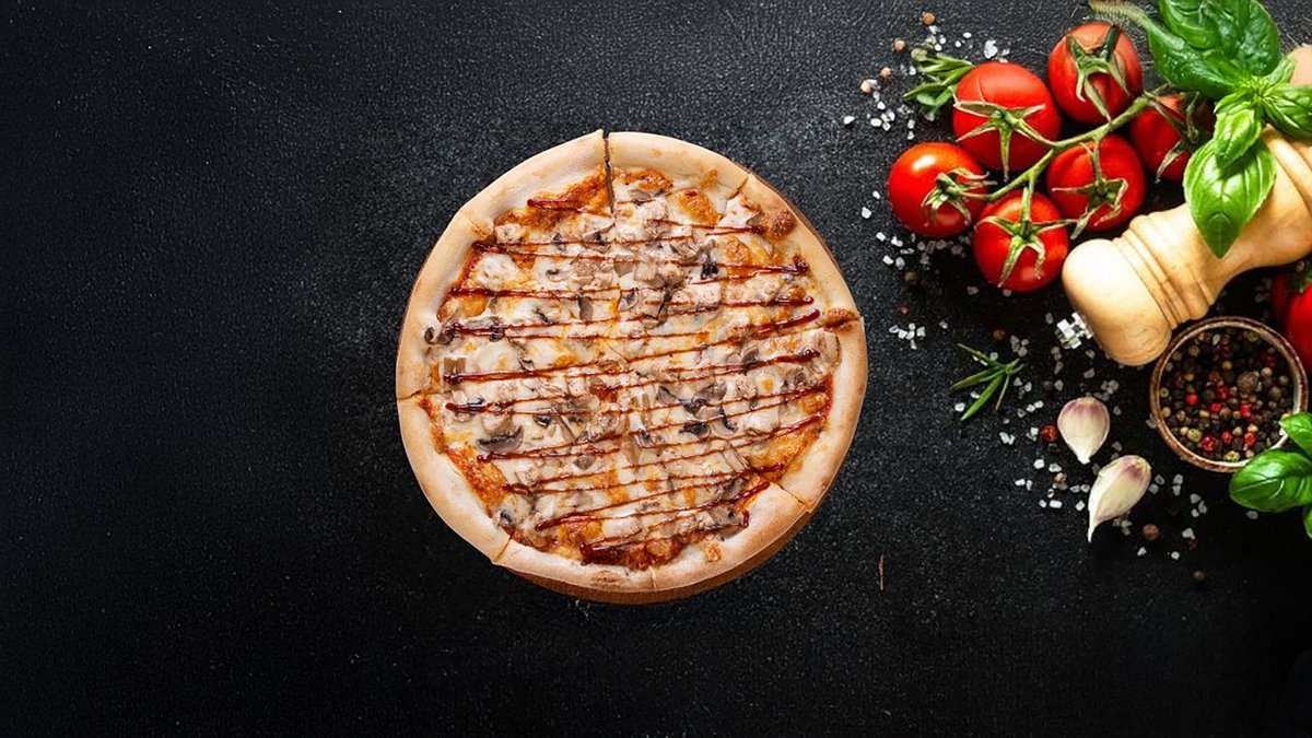 Bbq sousu, mozzarella pendiri, toyuq və mal əti dilimləri, soğan, bibər, qara zeytun