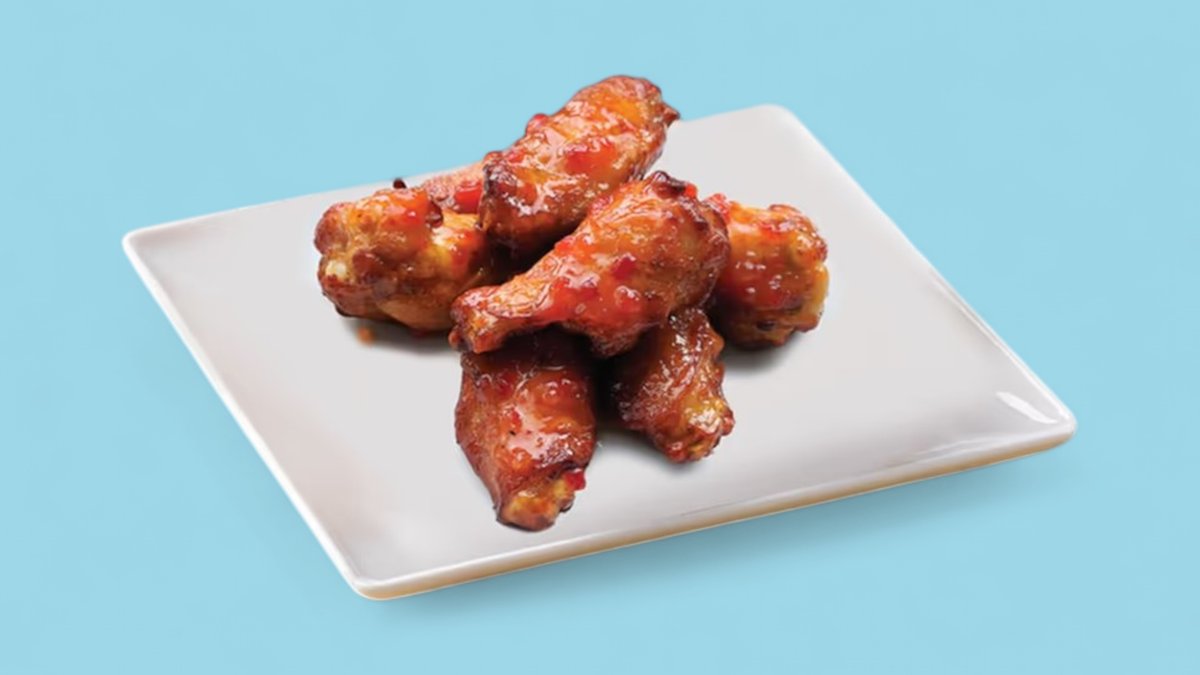 Xırtıldayan və ədviyyatlı toyuq qanadları, şirin çili sousu ilə servis olunur.