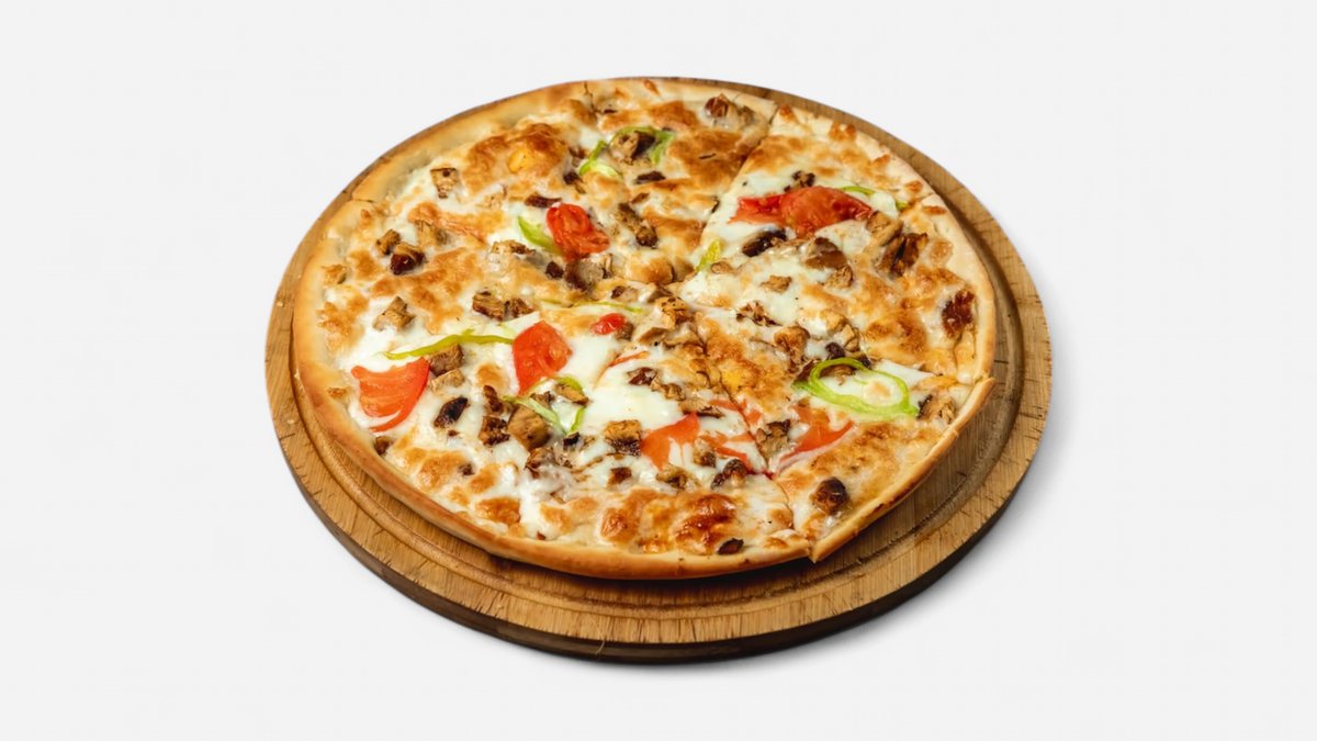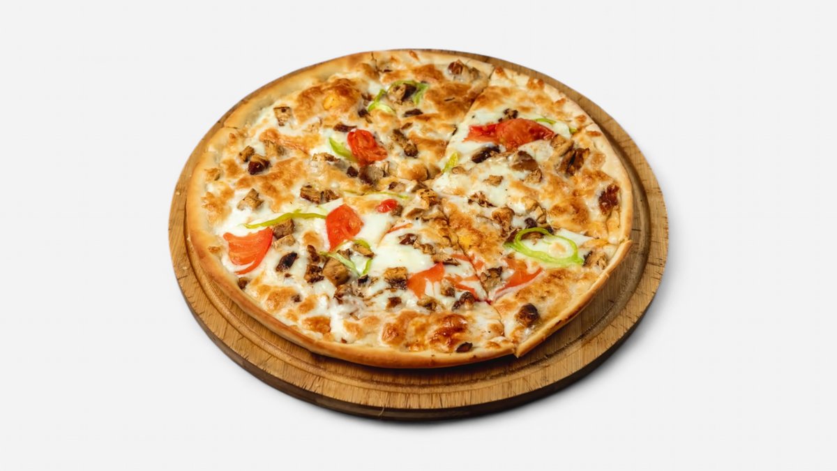 Pizza xəmiri, mozzarella pendiri, pizza sousu, toyuq filesi, pomidor, göbələk