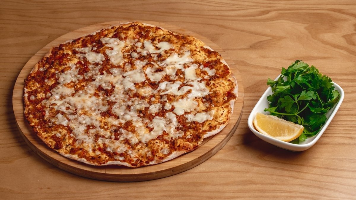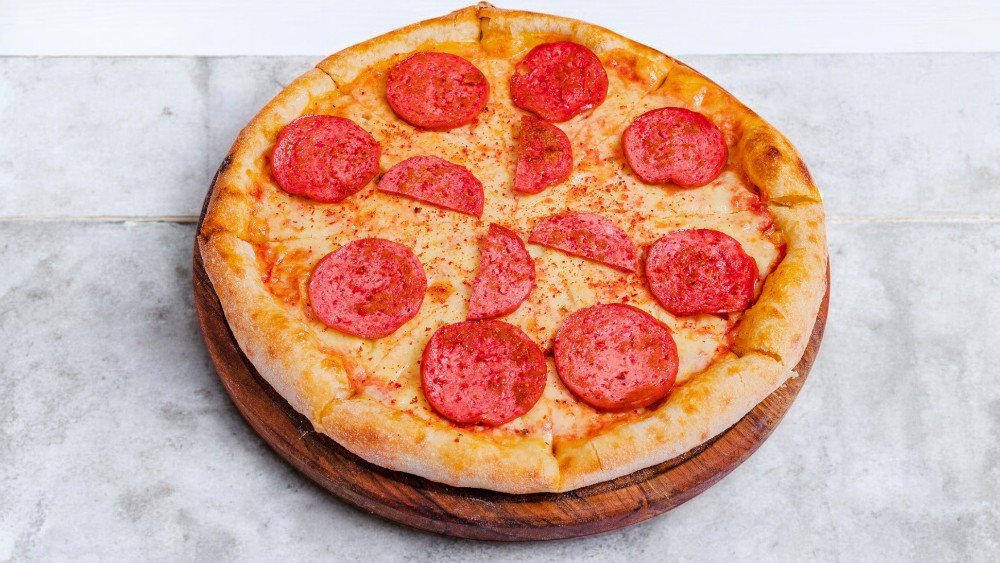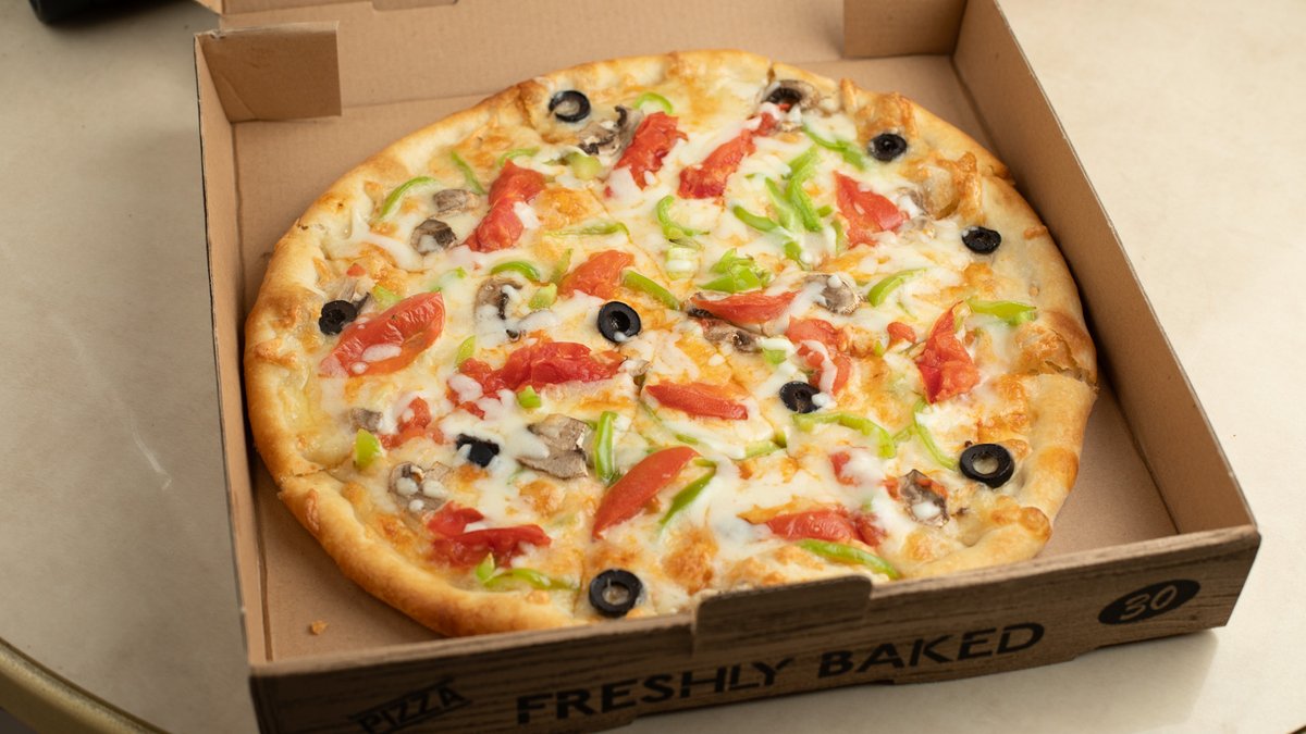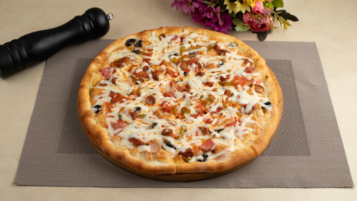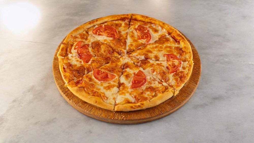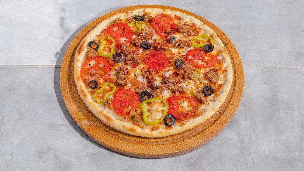 Pizza xəmiri, mozzarella pendiri, zeytun, pomidor