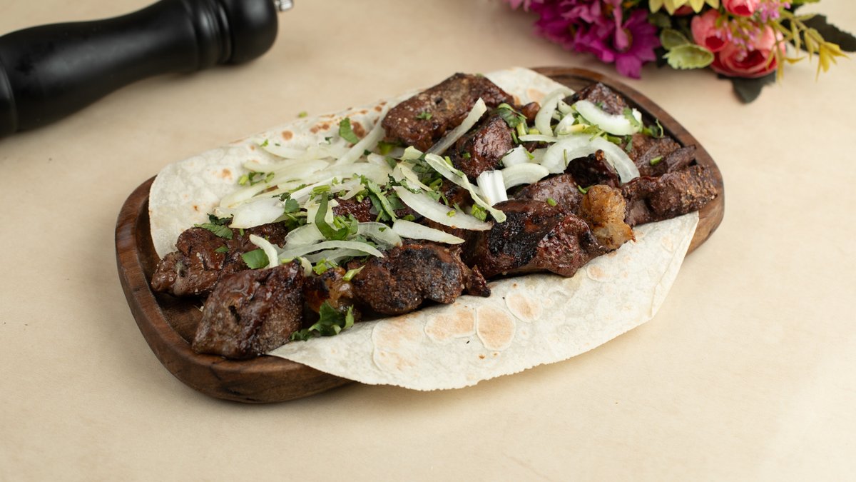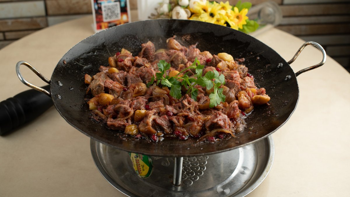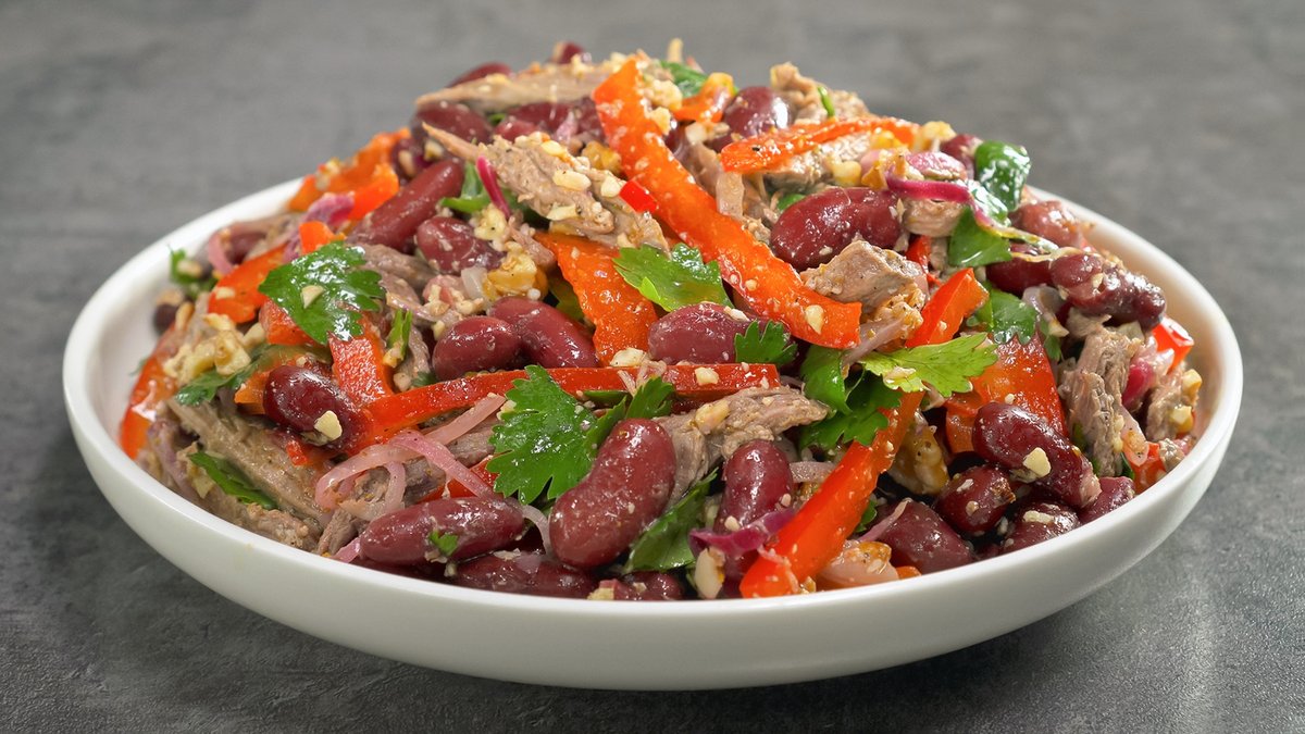 Can əti, bolqar bibəri, qırmızı soğan, pomidor, lobya, yaşıl yağ, alma sirkəsi, cəfəri, qoz ləpəsi