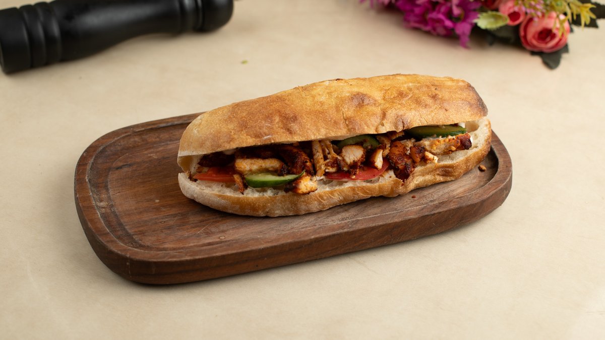 Toyuq əti, pomidor, xiyar, sous, mayonez