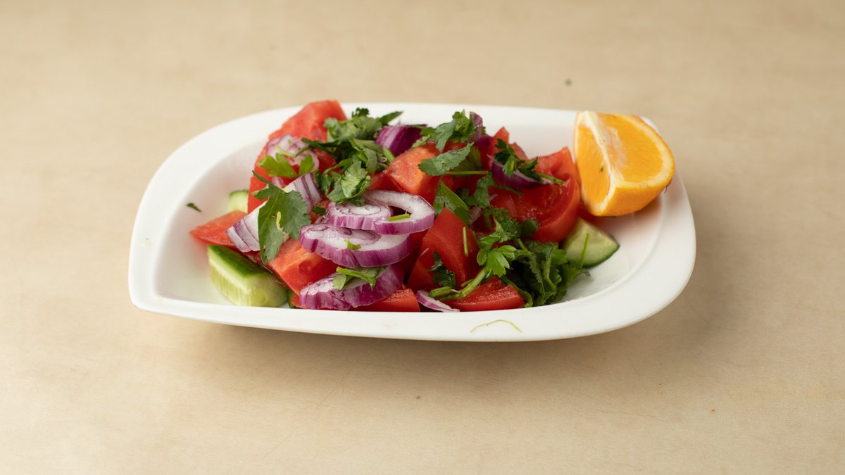 Bolqar bibəri, pomidor, xiyar, ağ pendir, qara zeytun, soğan